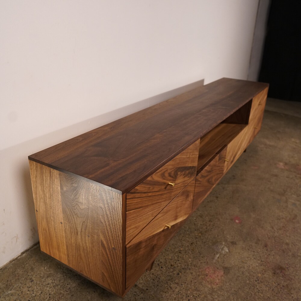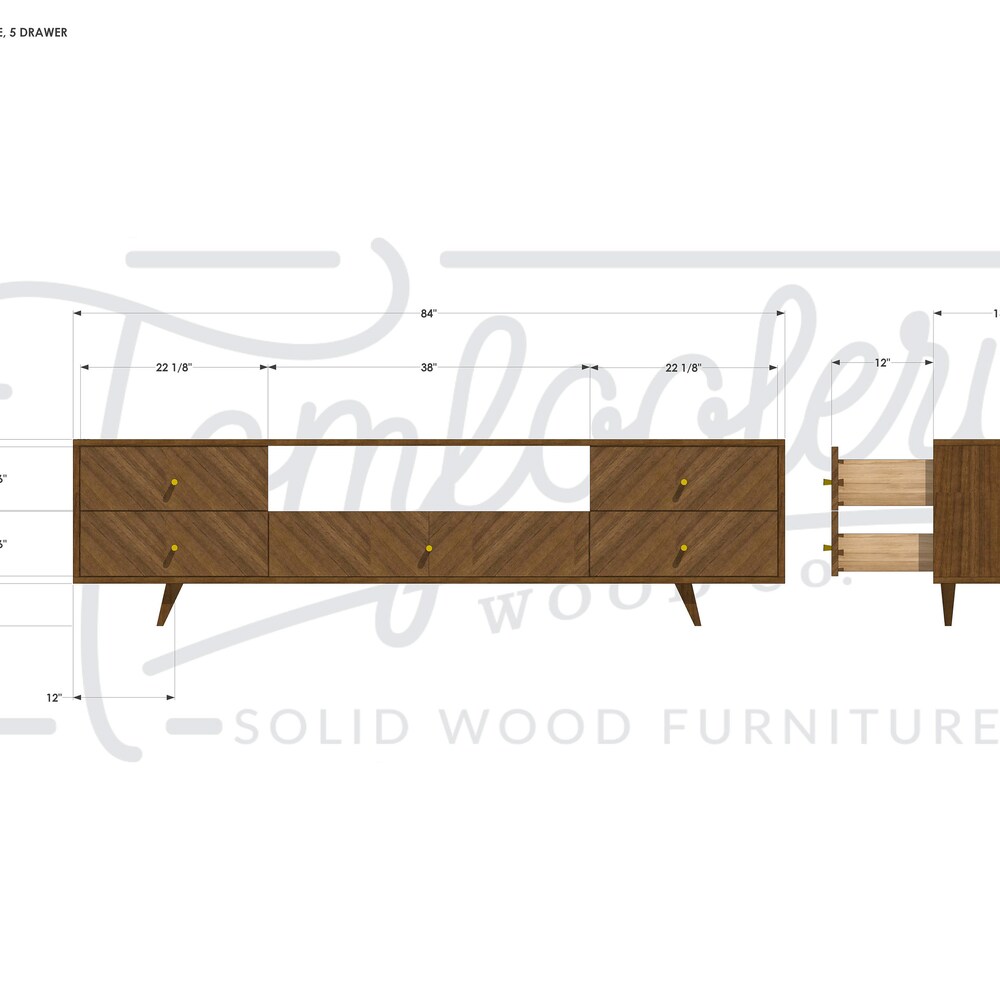 Brooklyn Media Console, 5 Drawer, 84″W, Chevron Pattern, Modern TV Credenza, Media Credenza (Shown in Walnut)