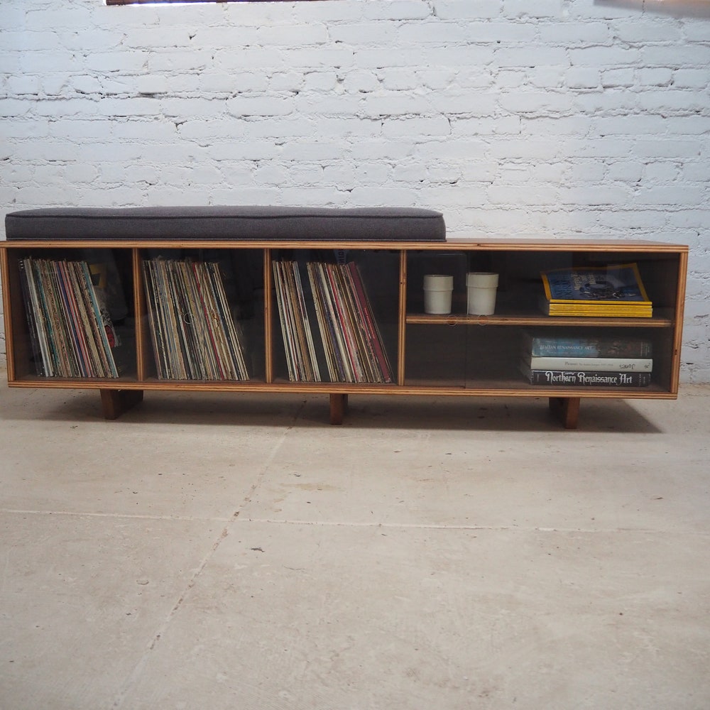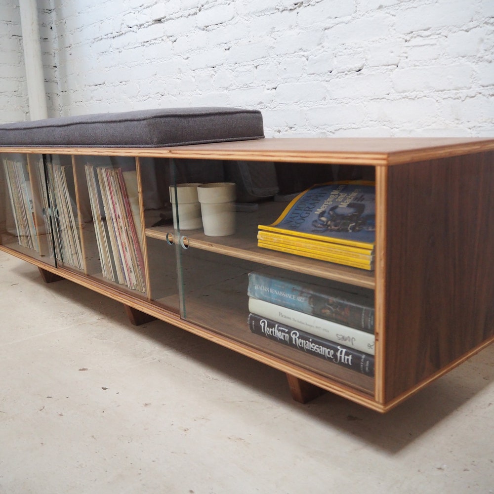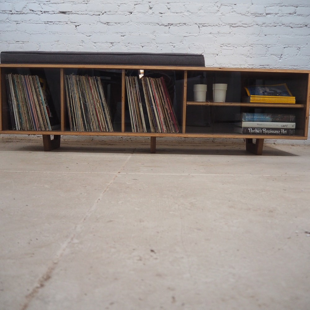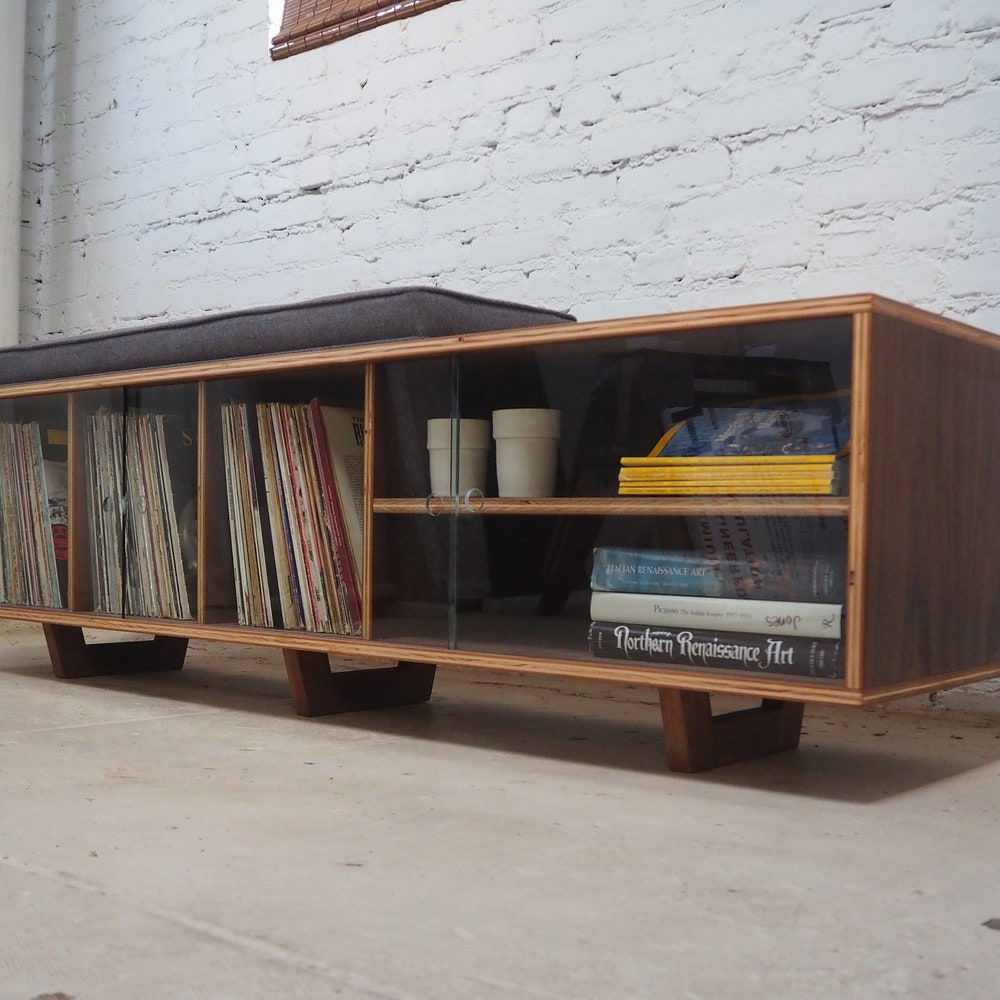 Cat Proof Lo-Fi Vinyl LP Storage bench with Mid Century Modern Stylings