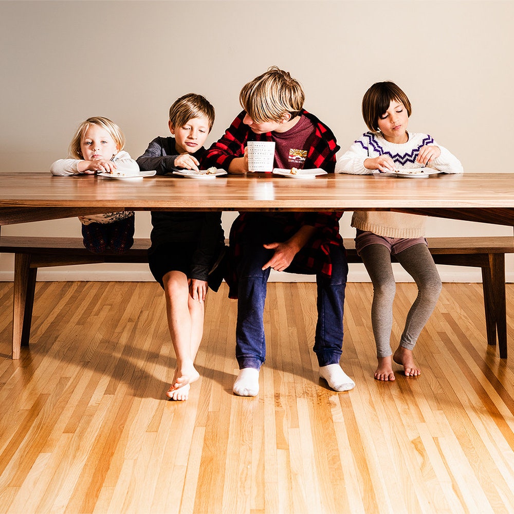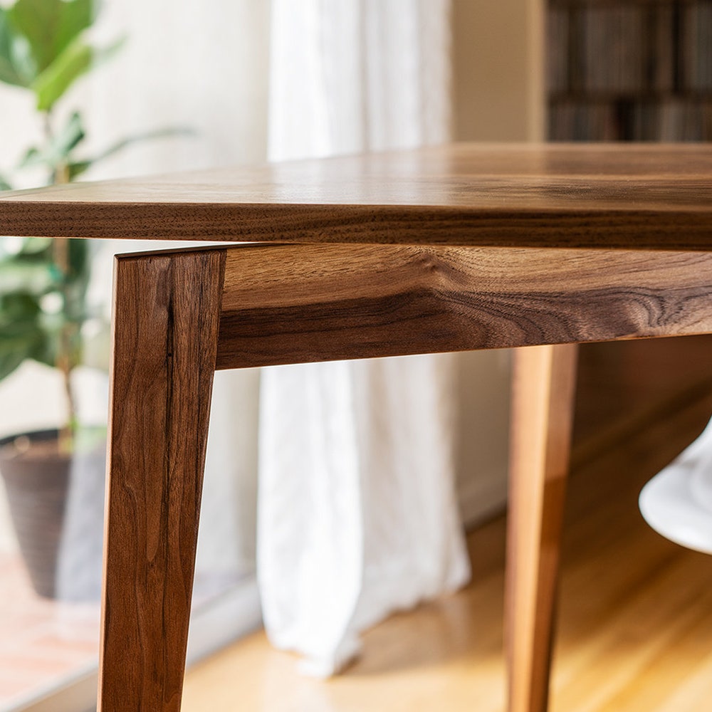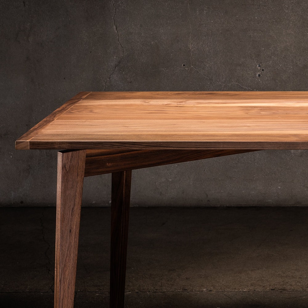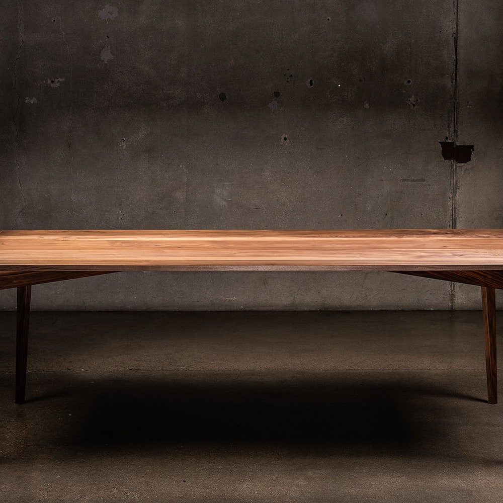 Charis is the Greek word for grace. A dinner table is a place of grace, where we gift each other with food, conversation, and family. And this table features a solid walnut top gracefully floating on elegant, angled legs. This dining table comfortably sits 8 people: as pictured, the table is 86″ long, 34″ wide and 30″ tall, but all dimensions can be customized.