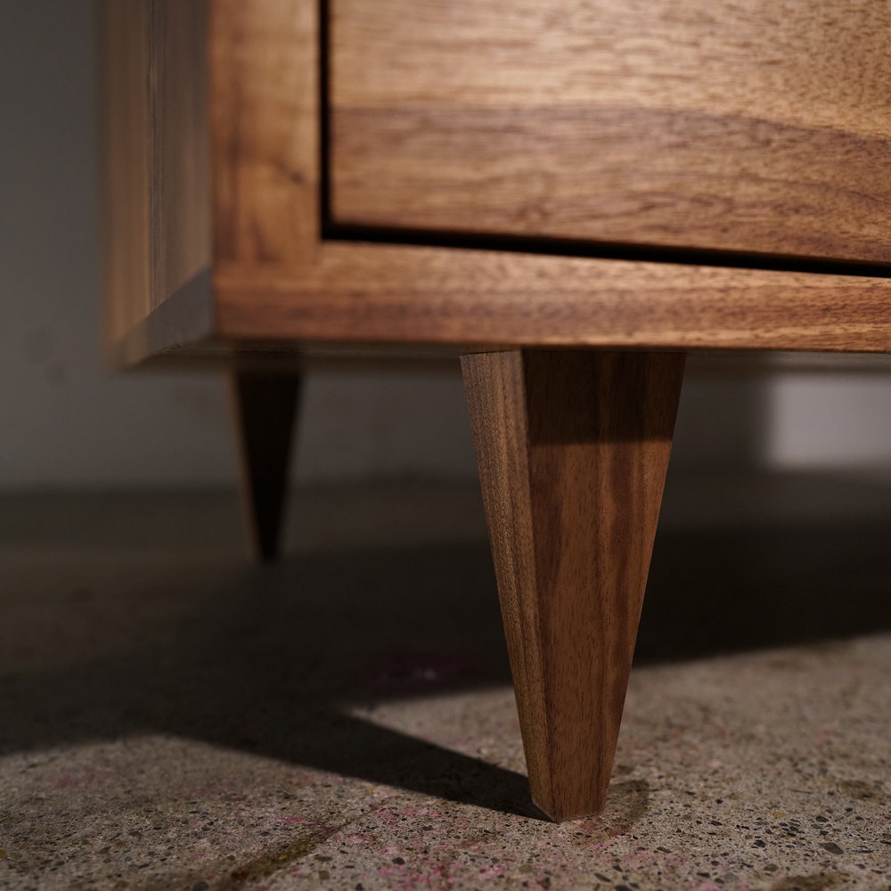 • Strong tapered legs. Mid-century style influence.