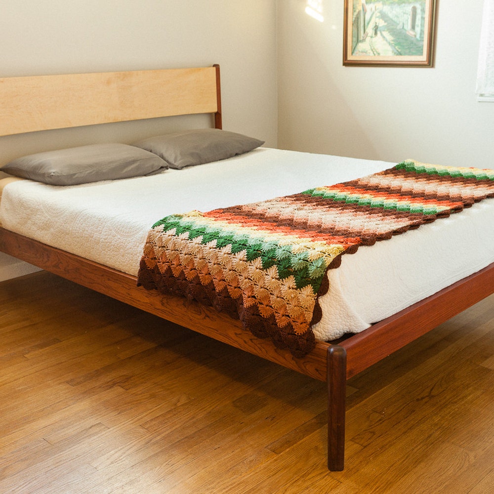 This bed is designed by yours truly and hand-built in Long Beach, CA. The bed can be built from walnut (first two pictures), a combination of jatoba and rosewood (second two pictures), cherry (third picture) or any other type of wood you desire. Though often imitated, the design is my own, inspired by a Mid Century/Danish modern aesthetic. All joinery is mortise and tennon- super strong and will last forever!