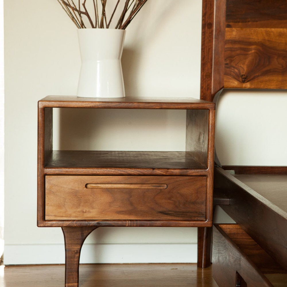 This piece is designed and hand-crafted by yours truly in Long Beach. The bed pictured is built from walnut, but I can use other woods upon request. The design is my own, inspired by the Scandinavian furniture of the 50’s (Danish/Mid Century Modern). All joinery is mortise and tennon, which means it’s strong and built to last forever.