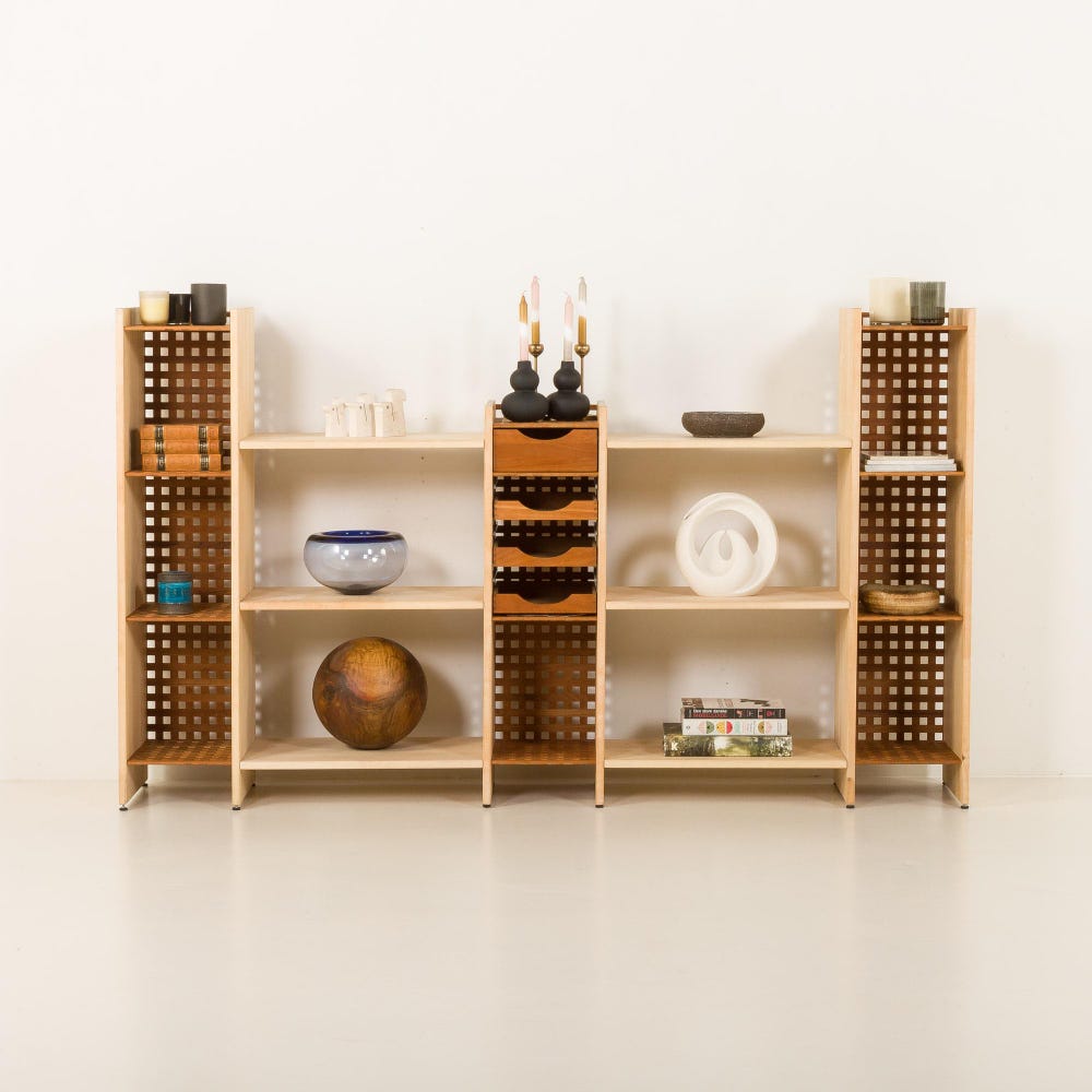 The piece is divided into five sections featuring three vertical shelving columns, and six interconnecting shves in two sections. The composition has an eye-catching lattice pattern, adding texture and light, while multiple shelves and drawers create a unique and practical storage solution.