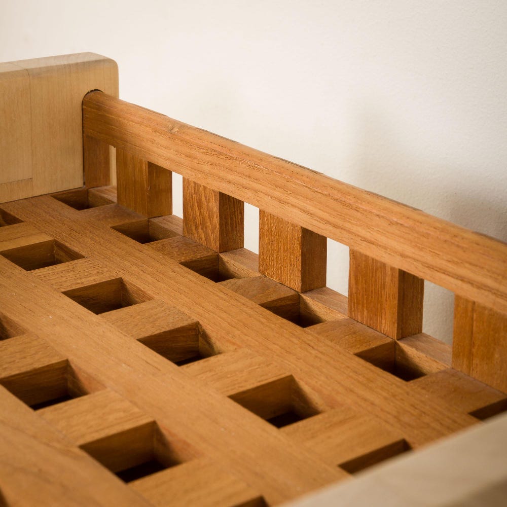 The bookcase, crafted in solid teak and beech creates exceptional openwork construction.