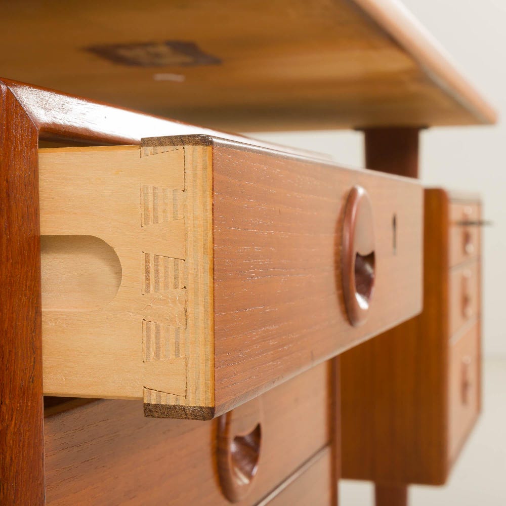 This Danish teak executive desk from the 1960s, was most likely made by Feldballes Möbelfabrik and closely resembles Model 60, designed by Kai Kristiansen. Crafted from high-quality teak, it showcases the wood’s warm tones and rich grain. Renowned for his functional yet elegant designs, Kristiansen’s influence is evident in the desk’s meticulous craftsmanship and thoughtful details (the construction in exactly the same as in Model 60 and it comes apart the same way).