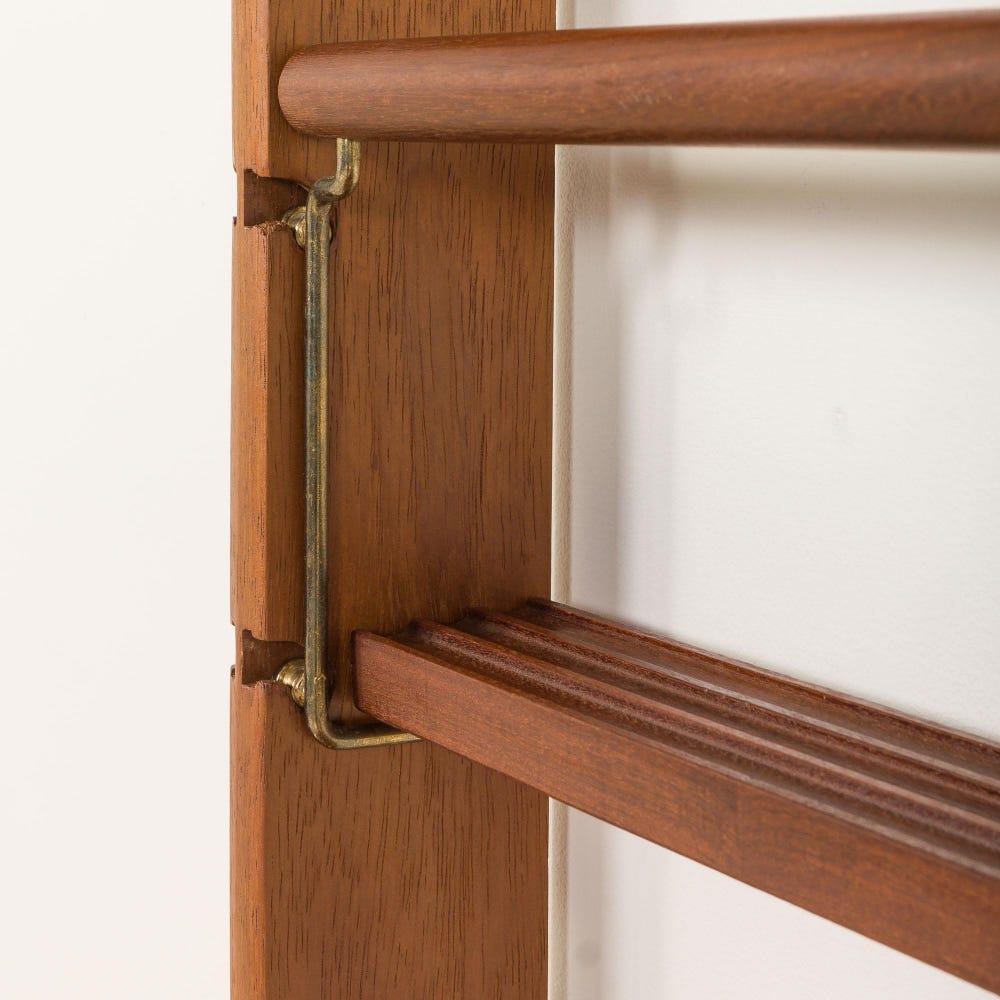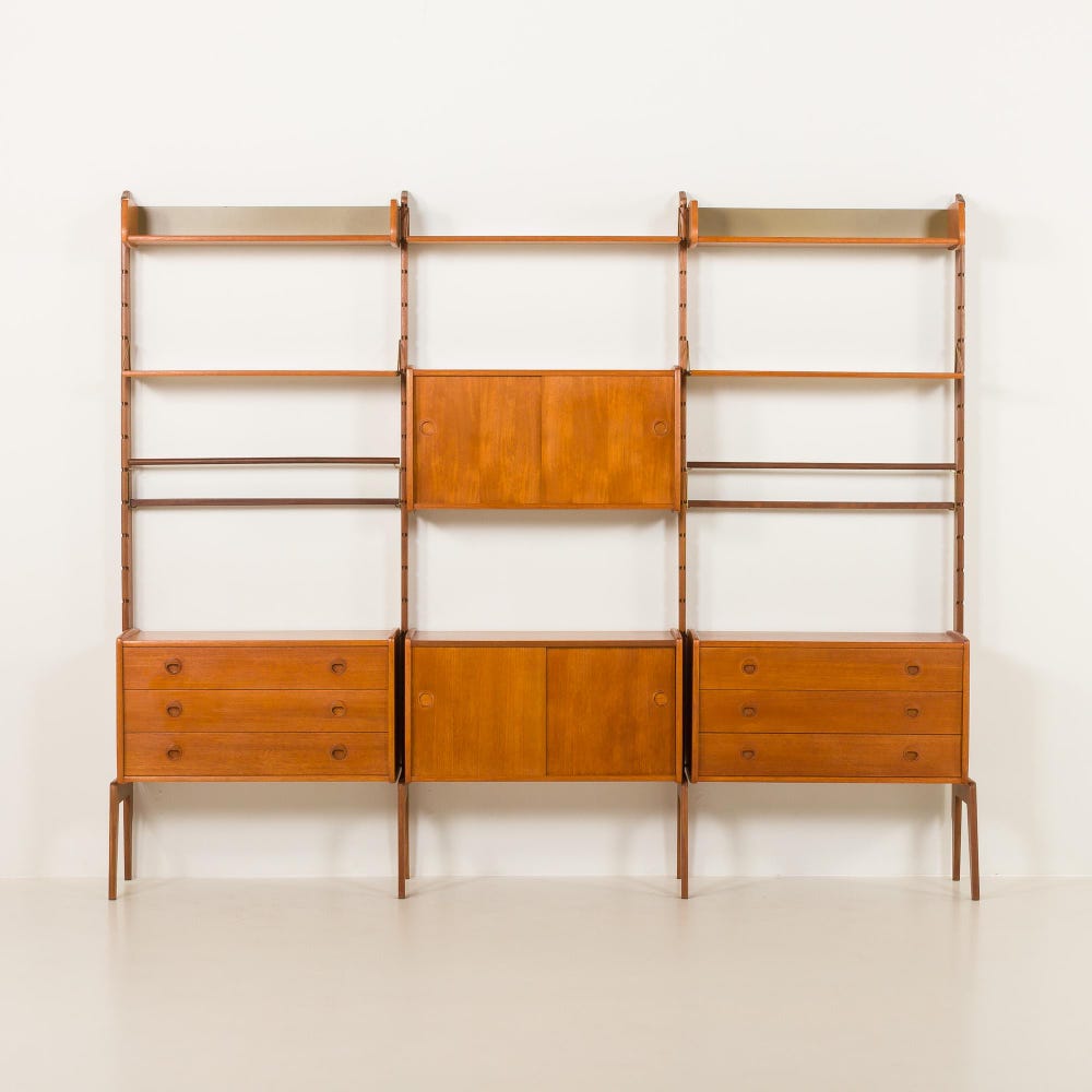A truly Scandinavian modern freestanding wall unit called ” Ergo “, was designed by John Texmon and Einar Blindheim for Blindheim Møbelfabrikk and crafted in Norway in the 1960s. It is a beautifully balanced blend of form and function. This piece features slightly curved edges that lend warmth, while the sculptural vertical rails give it an elegant and architectural presence. It is made of light-tone teak wood, very appealing in smaller and larger spaces. Many stores in Paris, Tokyo, and London, use these shelving systems as a display unit for clothing, perfumes, or other goods. Perfect for private space as well.