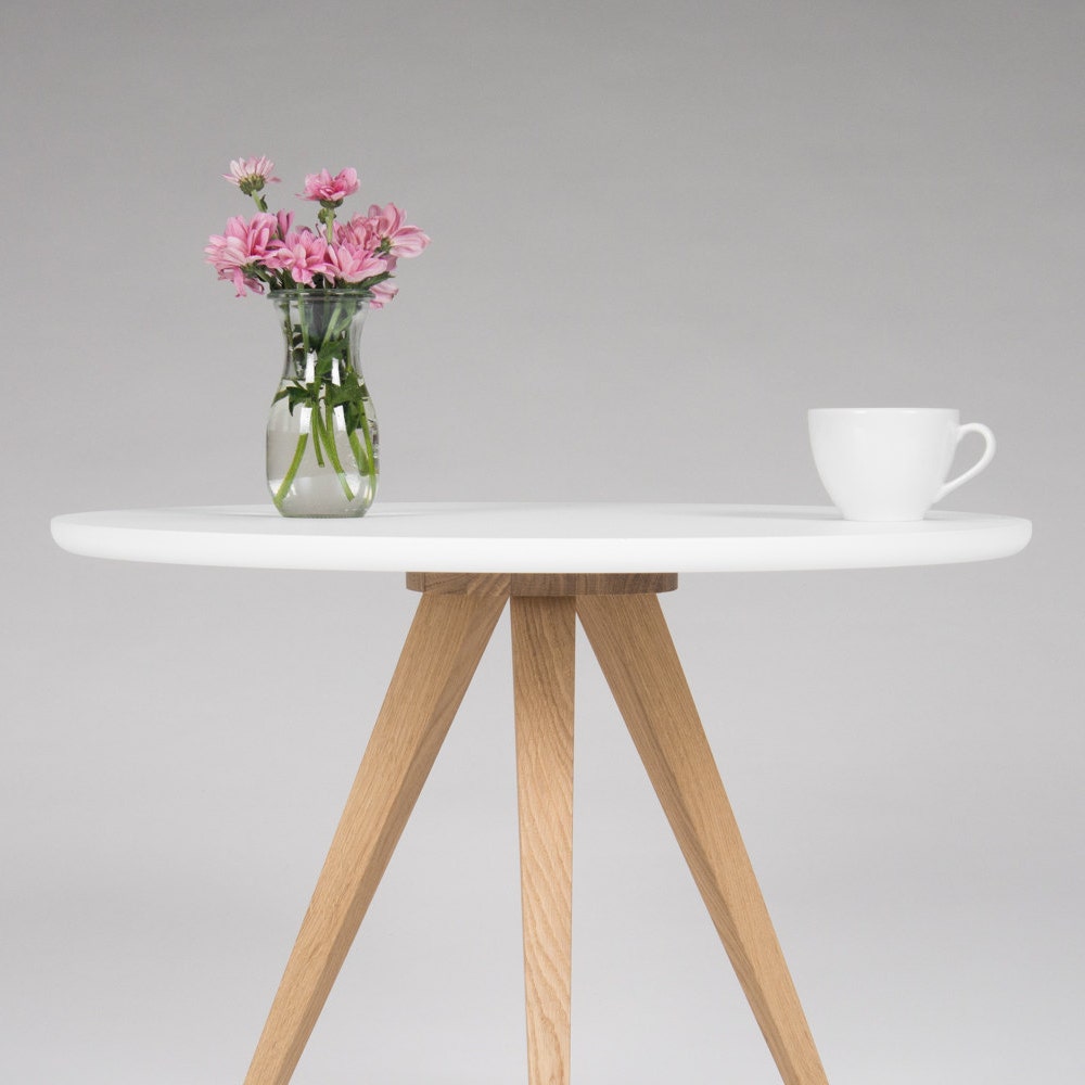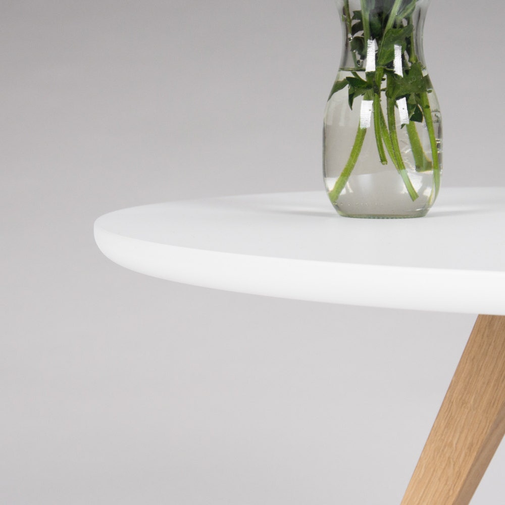 FINN 3 – White round coffee table, with solid oak legs, scandinavian design