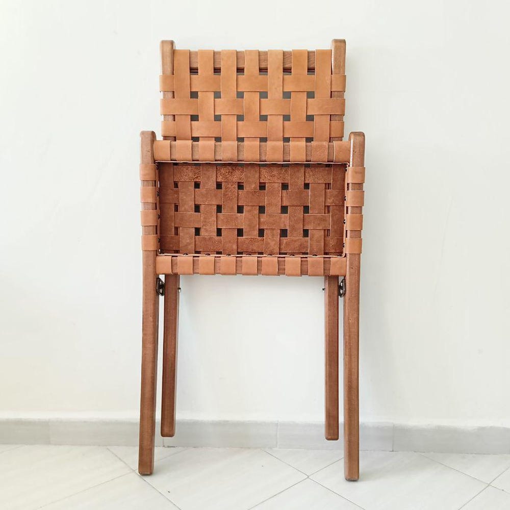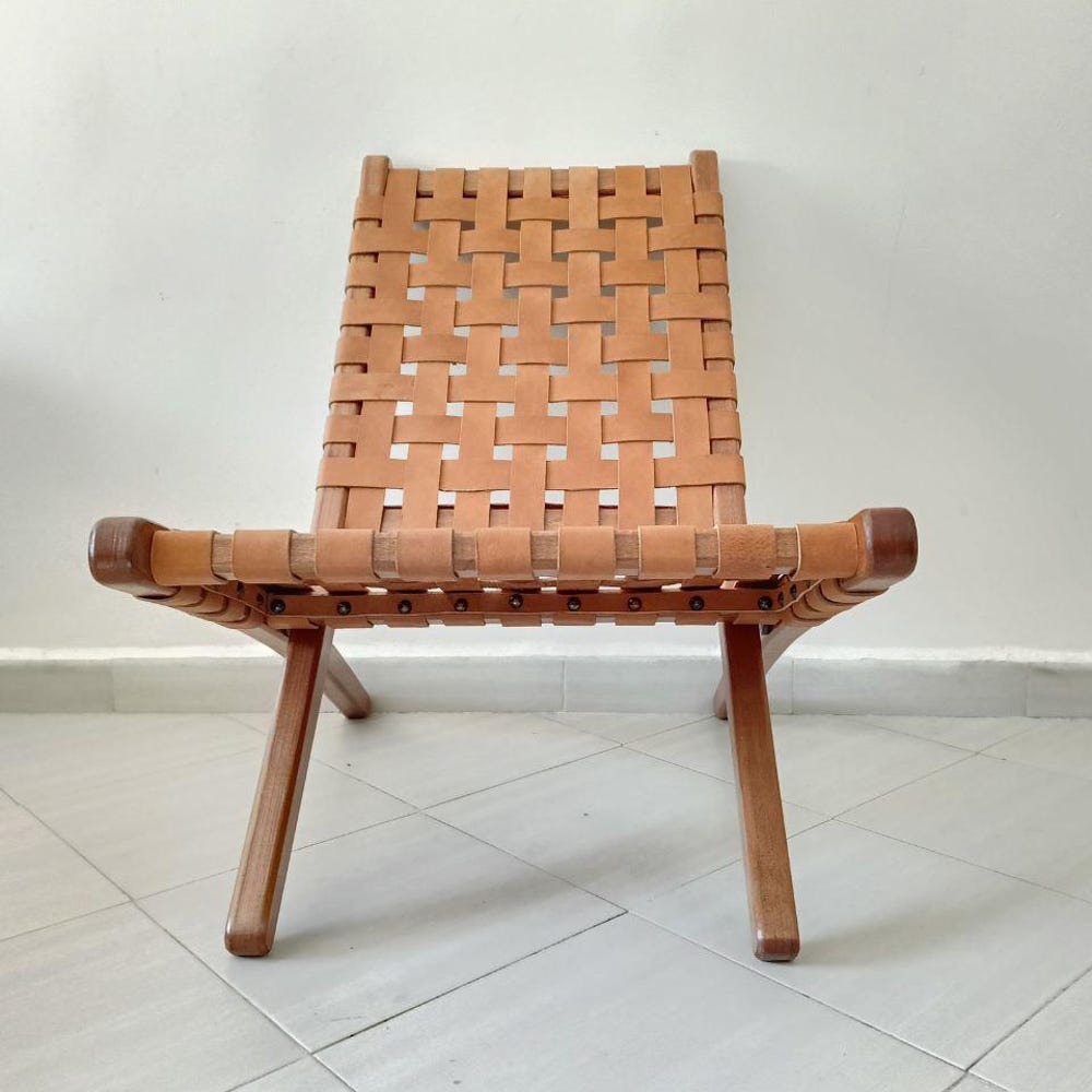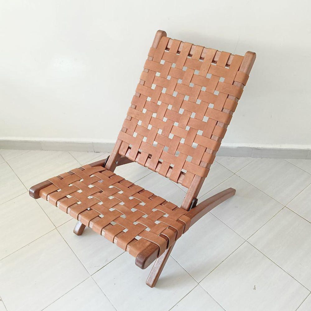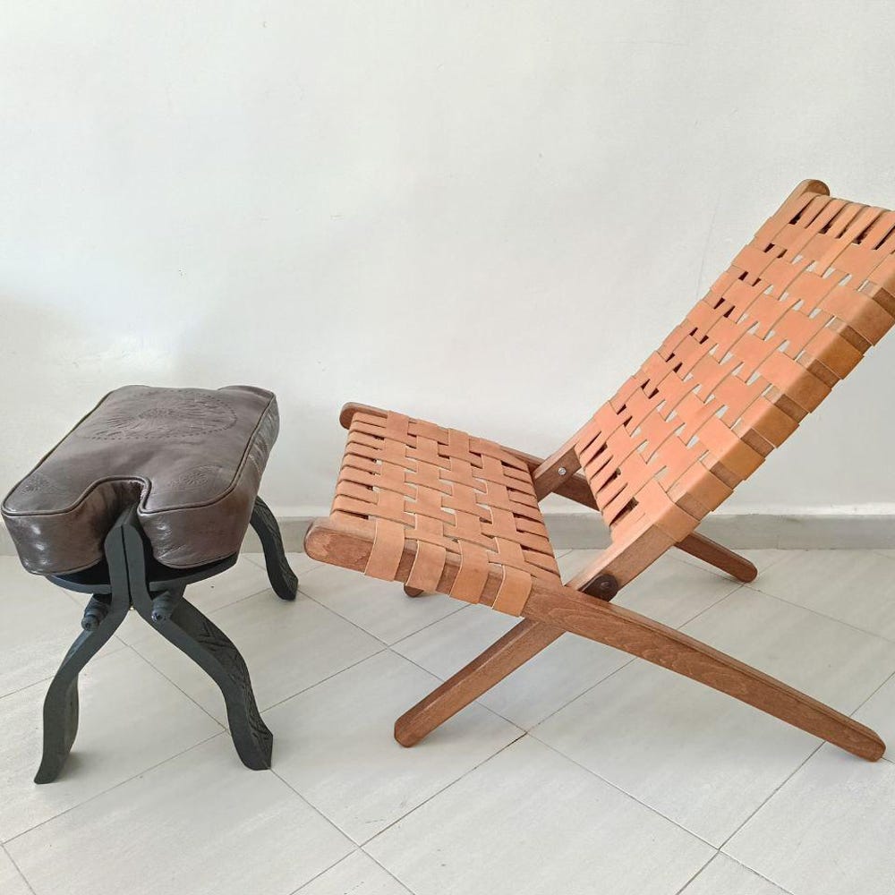 Enhance your space with this handcrafted foldable tan leather chair, a perfect blend of elegance and comfort. Made with high-quality woven leather and a sturdy wooden frame, this boho-style lounge chair is ideal for reading, relaxing, or adding a mid-century modern touch to your home. The foldable design makes it easy to store, while the handwoven leather seat ensures durability and comfort. Whether placed in a living room, bedroom, or reading nook, this chair is a timeless addition to any decor.