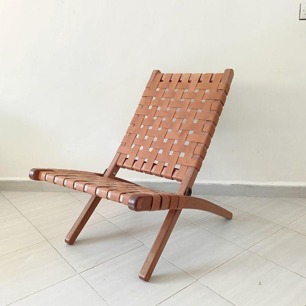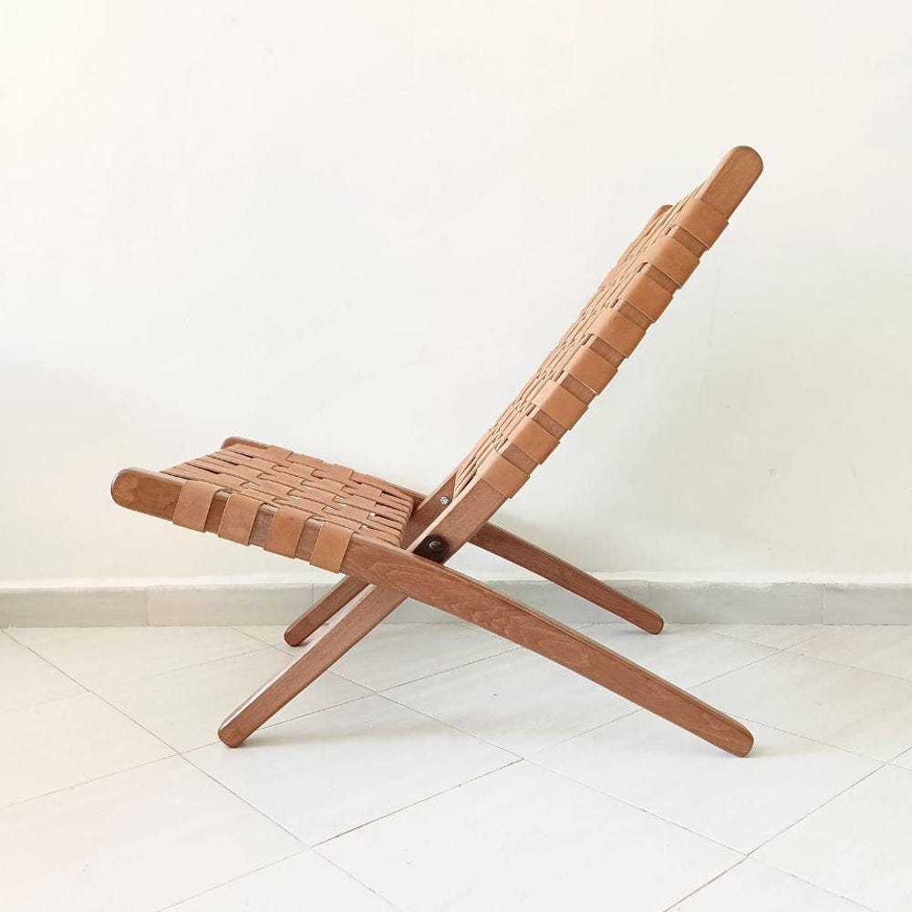 Foldable Woven Leather Chair – Handmade Tan Leather Lounge Chair – Wooden Accent Chair – Boho Reading Chair – Wood Relax Chair for Living Room