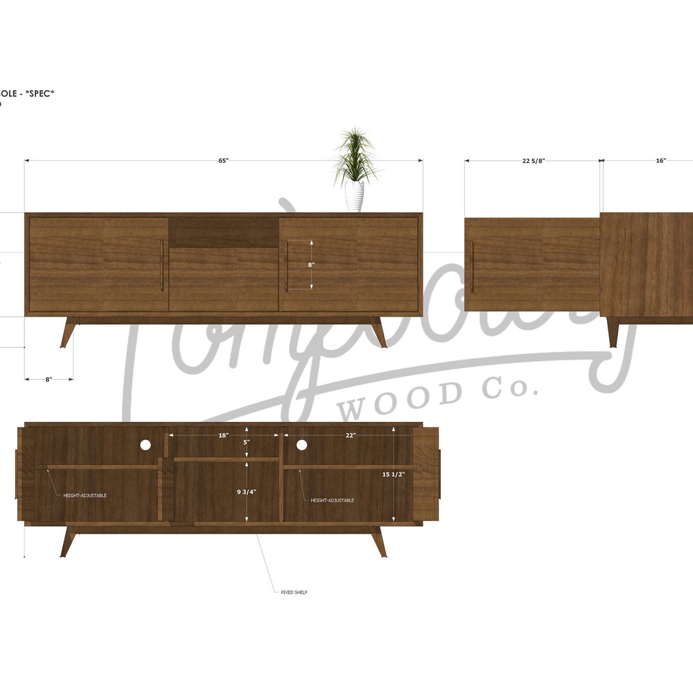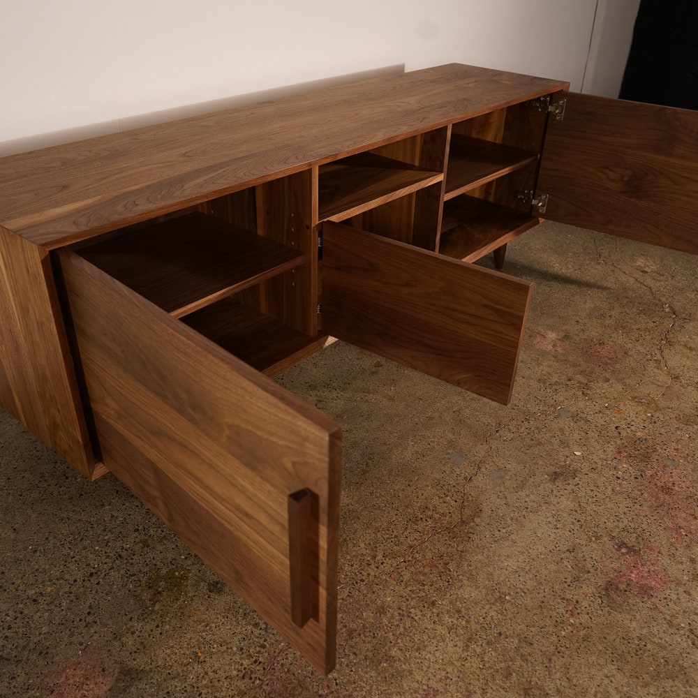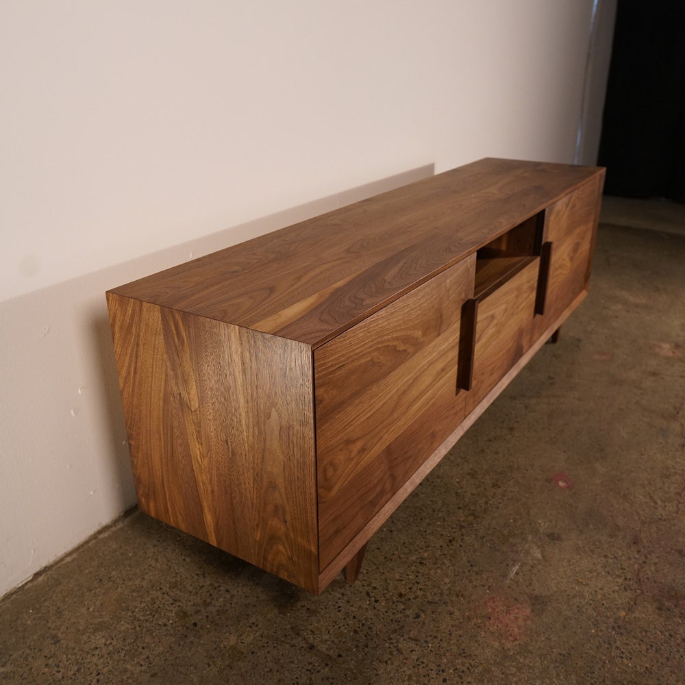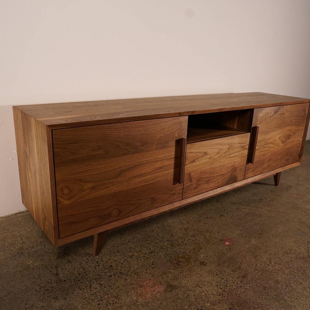 Hein Modern Console, 65″W, Mid-Century Media Console, Modern Solid Wood Credenza, Modern Sideboard (Shown in Walnut)