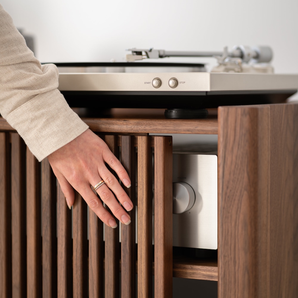This record player stand distinguishes itself with unique, sliding doors crafted from meticulously cut walnut slats. These doors are not just visually appealing but also functional, assisting in amplifier control and facilitating effective heat dispersion, which ensures proper ventilation for your audio equipment.