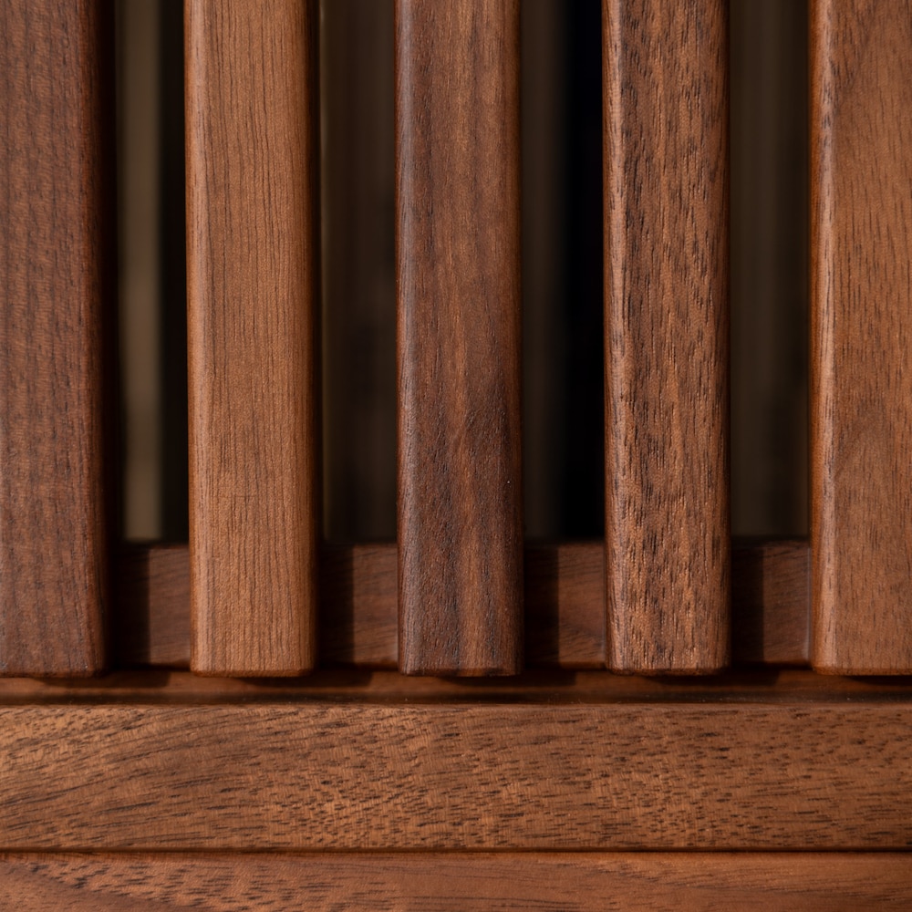 Innovative Design: The media console stands out with its sliding doors made of hand-cut slats, adding charm and supporting amplifier control and heat dissipation, ensuring optimal ventilation for audio equipment.