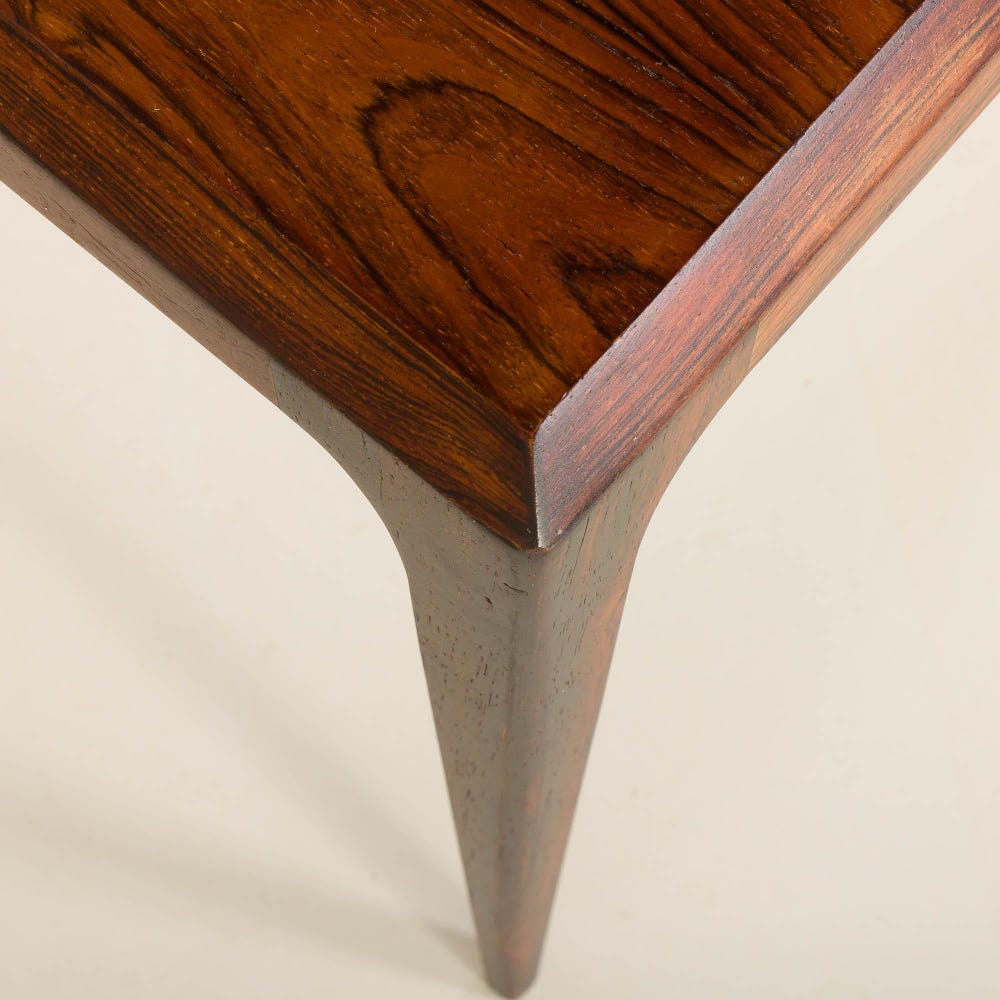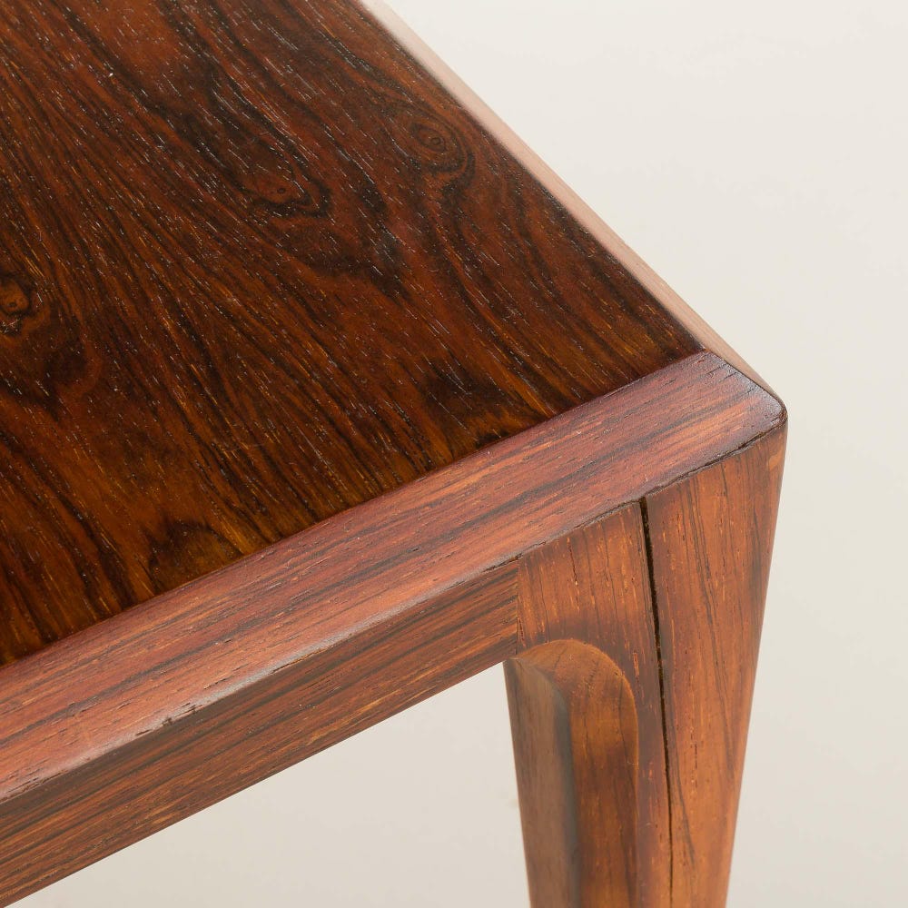 Crafted from solid rosewood, it features a rich grain, gently curved legs, and a beveled tabletop. Its rosewood structure has a warm, rich grain and a sleek, minimalist design.