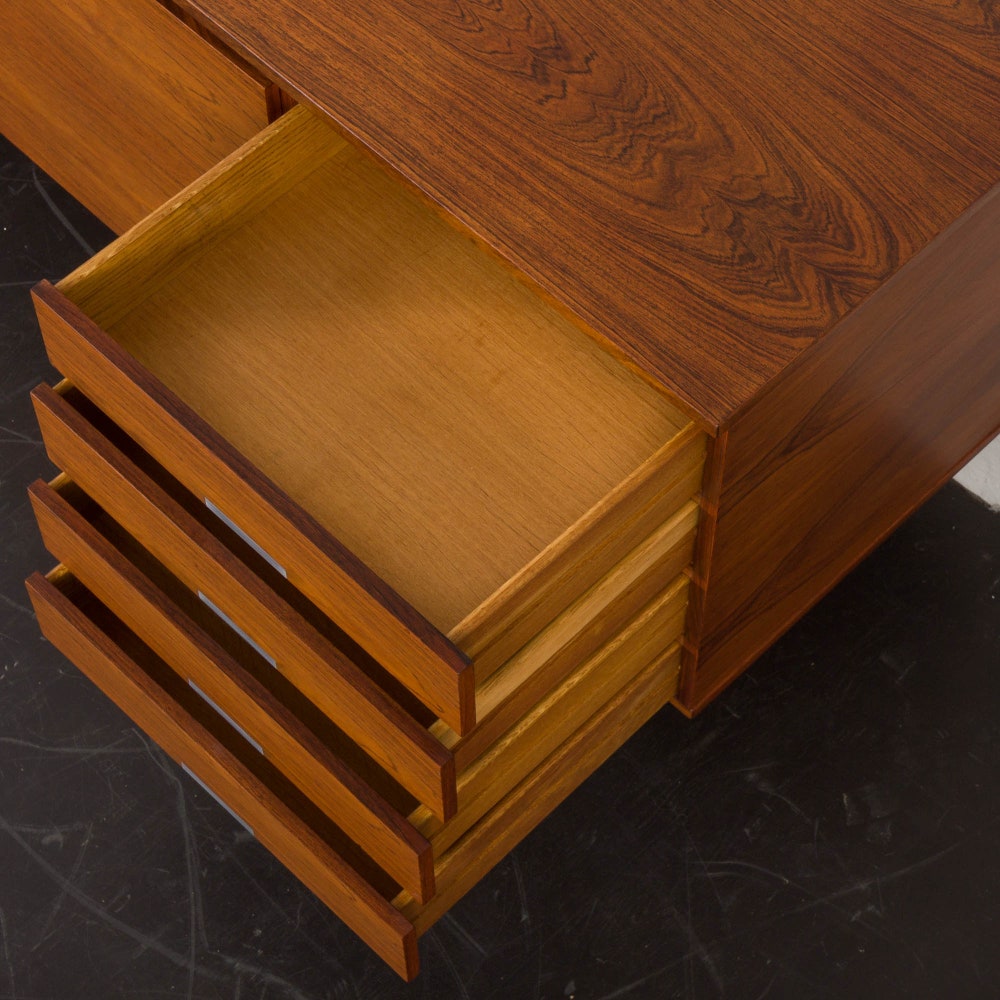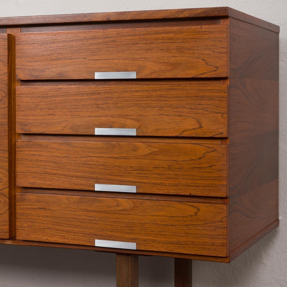 A stunning rosewood sideboard with beautiful wood grain and detail in aluminum designed by Kai Kristiansen for Feldballes Møbelfabrik in 1958. It features two cabinets and four drawers. The left, hinged door cabinet has two inside shelves, and the middle, double doors cabinet includes a long one. Combined with four drawers – on the right […]