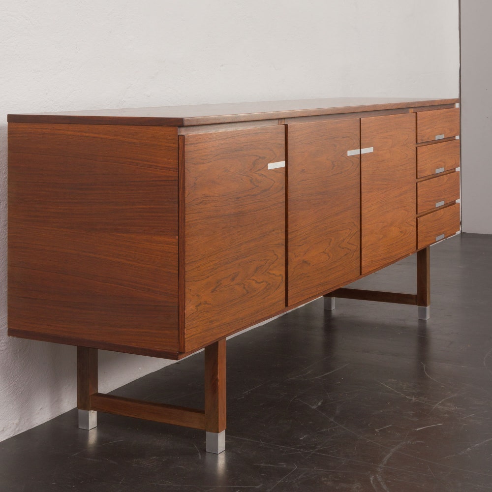 The cooperation between the attractiveness of rosewood and aluminum probably brings out the eminence of the materials to the maximum. The clean form featuring straight lines and aluminum parts used for the handles and legs gives a sense of modernity and elegance to the Scandinavian mid-century design offered by Feldballes Møbelfabrik.