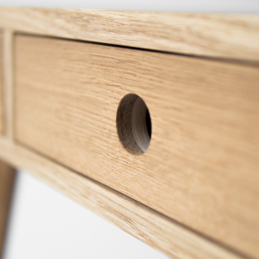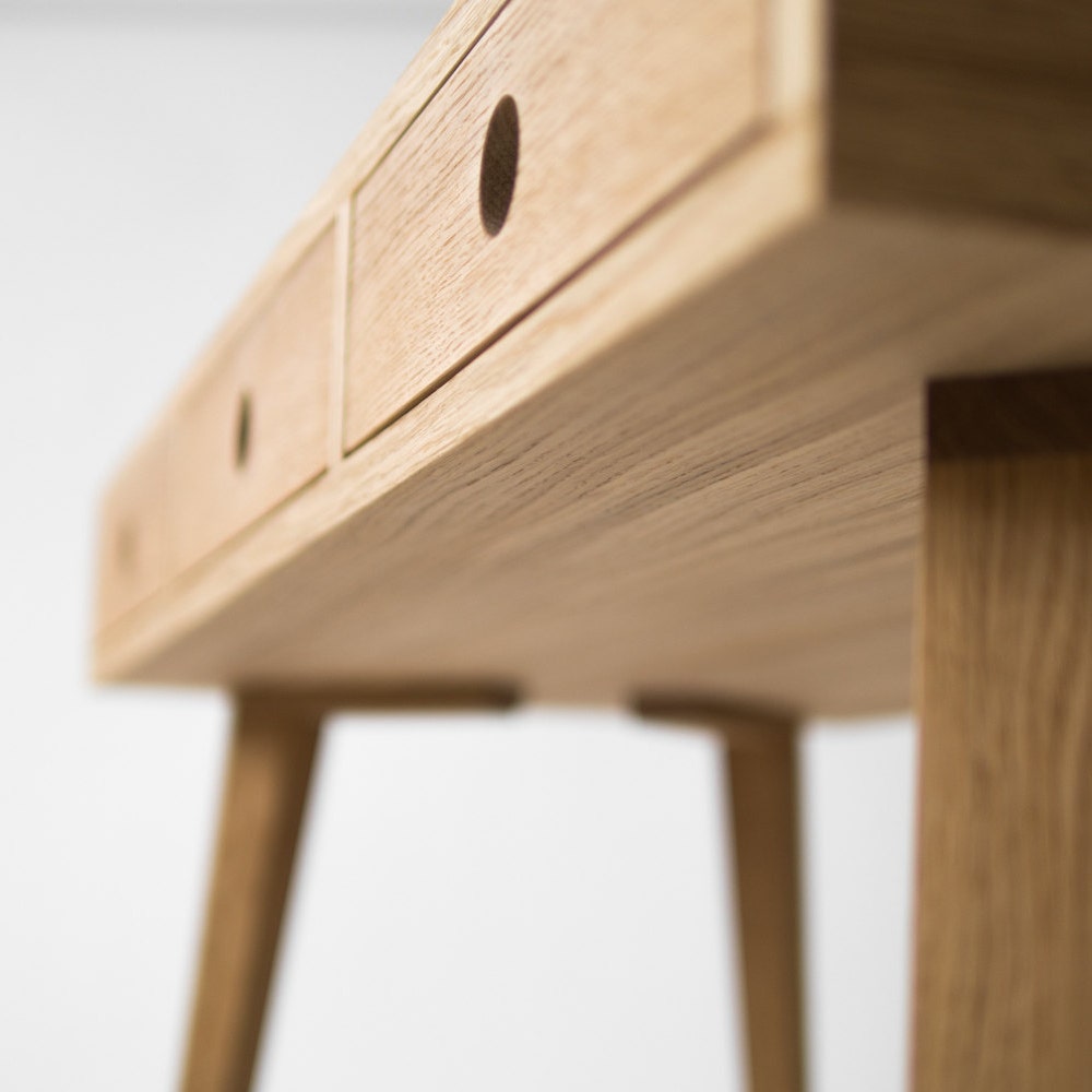 Our desk made of solid oak wood and wood covered with natural oak veneer has been perfectly finished with hardwax oil. With the geometric design of legs, furniture creates an incomparable and unique form.