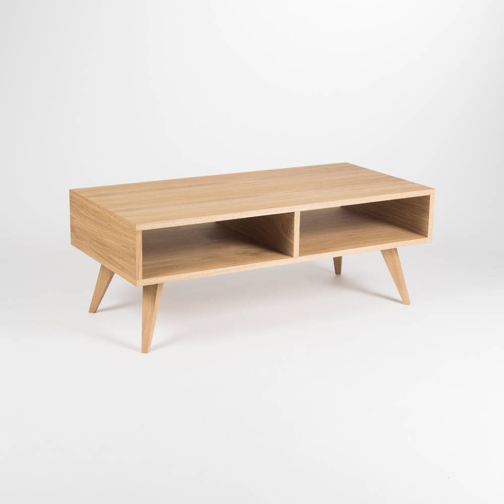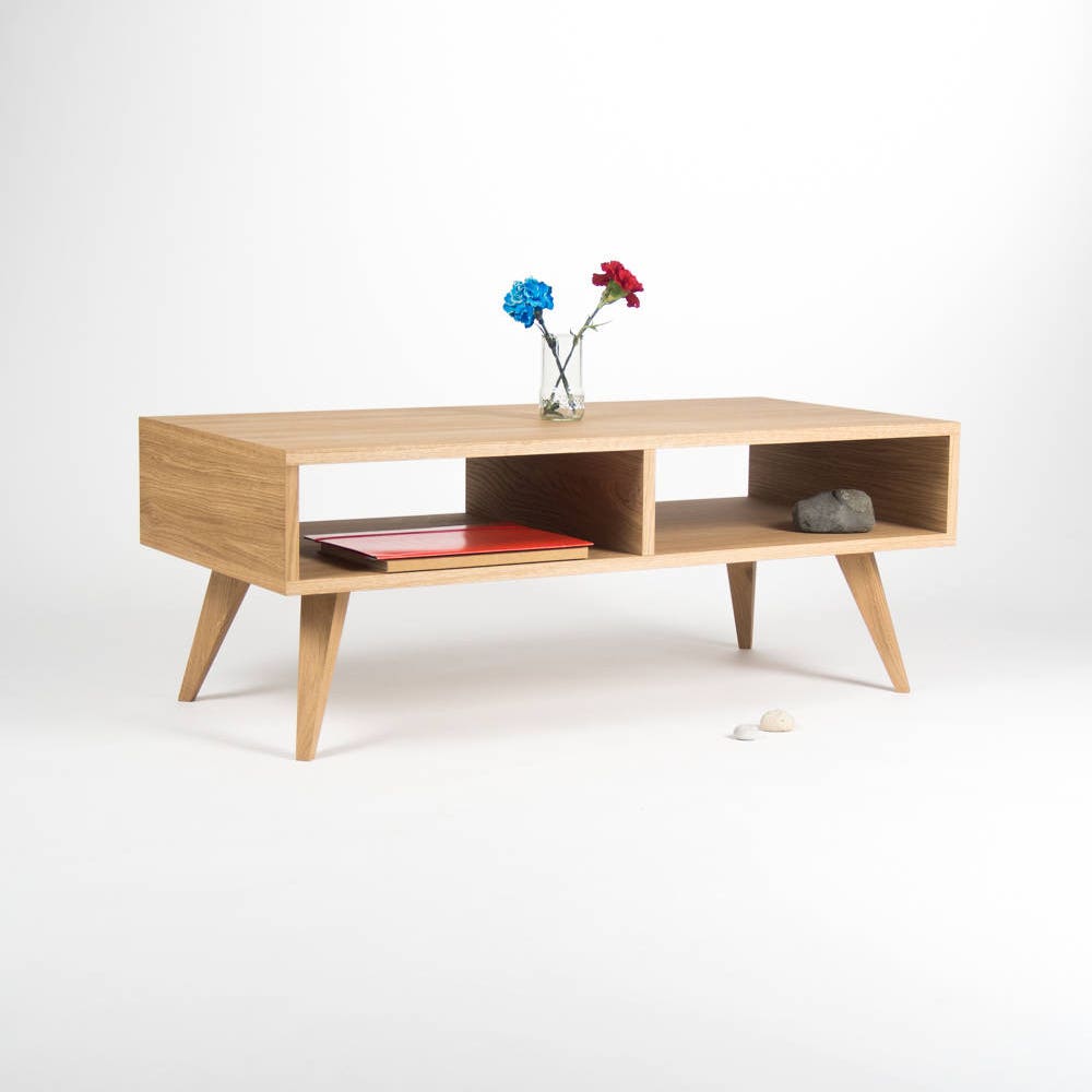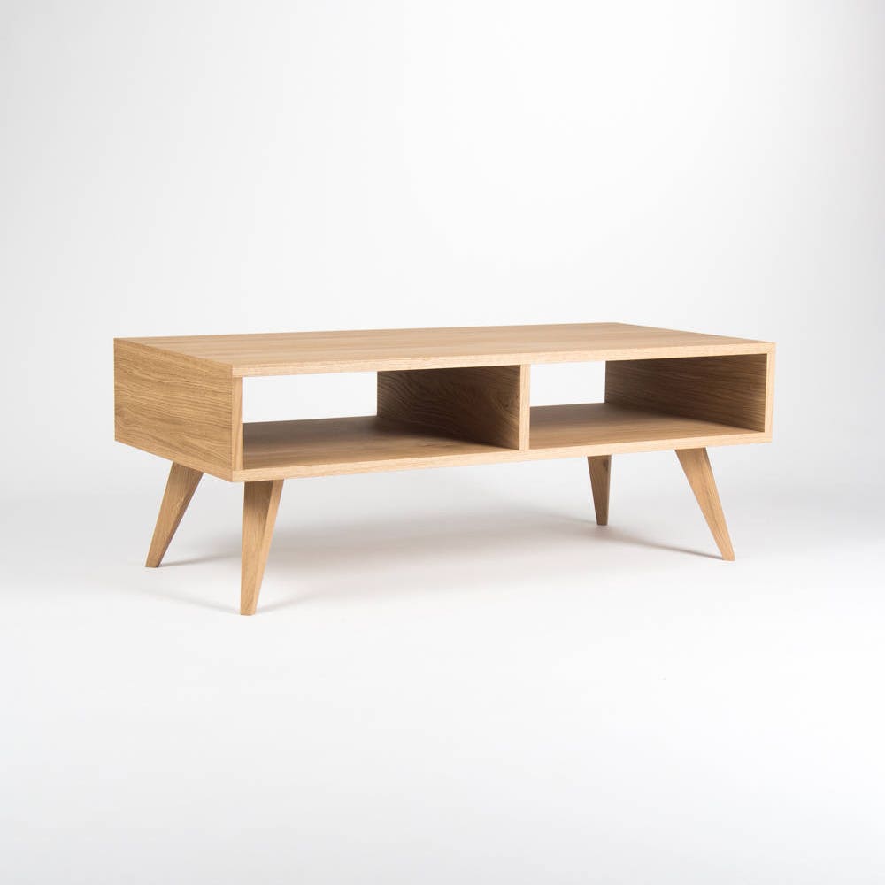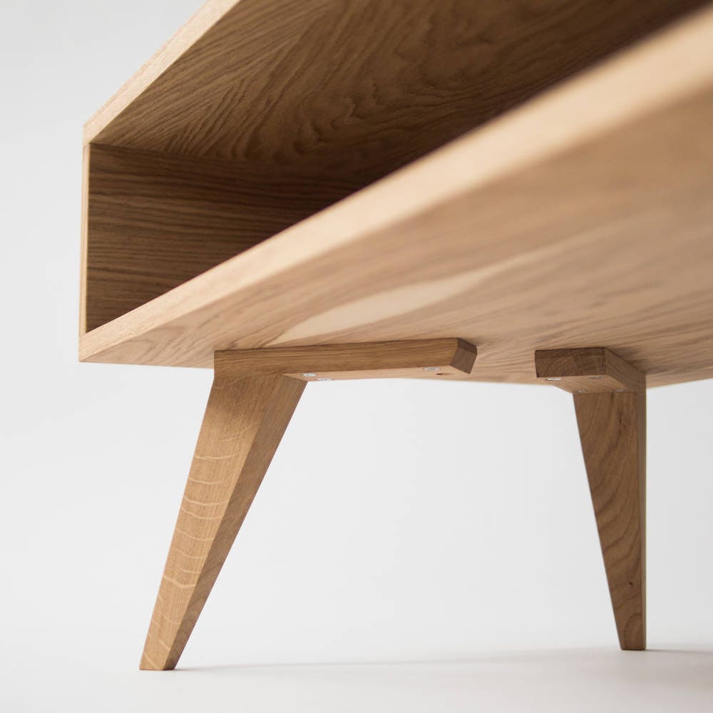 Our coffee table / TV stand is a piece of furniture, which thanks to its gentle form – inspired by the mid-century modern Scandinavian design – offers various applications. Its symmetry opens another, new possibilities – you can place it next to the wall or in the middle of the living room. Our table, made of solid oak wood and wood covered with natural oak veneer, has been perfectly finished with hardwax oil. This type of finishing allows the wonderful grain patterns to shine through and perfectly protects the surface.