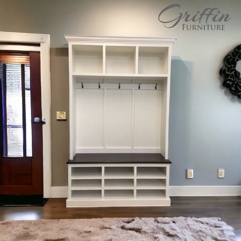 Mudroom entryway organizer bench, shoe storage and coat rack that allows for the perfect place to put your shoes, coats and bags! This unit is handcrafted made to order, comes with 6 standard hooks and lots of shoe storage. COLOR CHOICE:Shown Painted white with a protective finish and a stained dark walnut seat. Custom colors […]