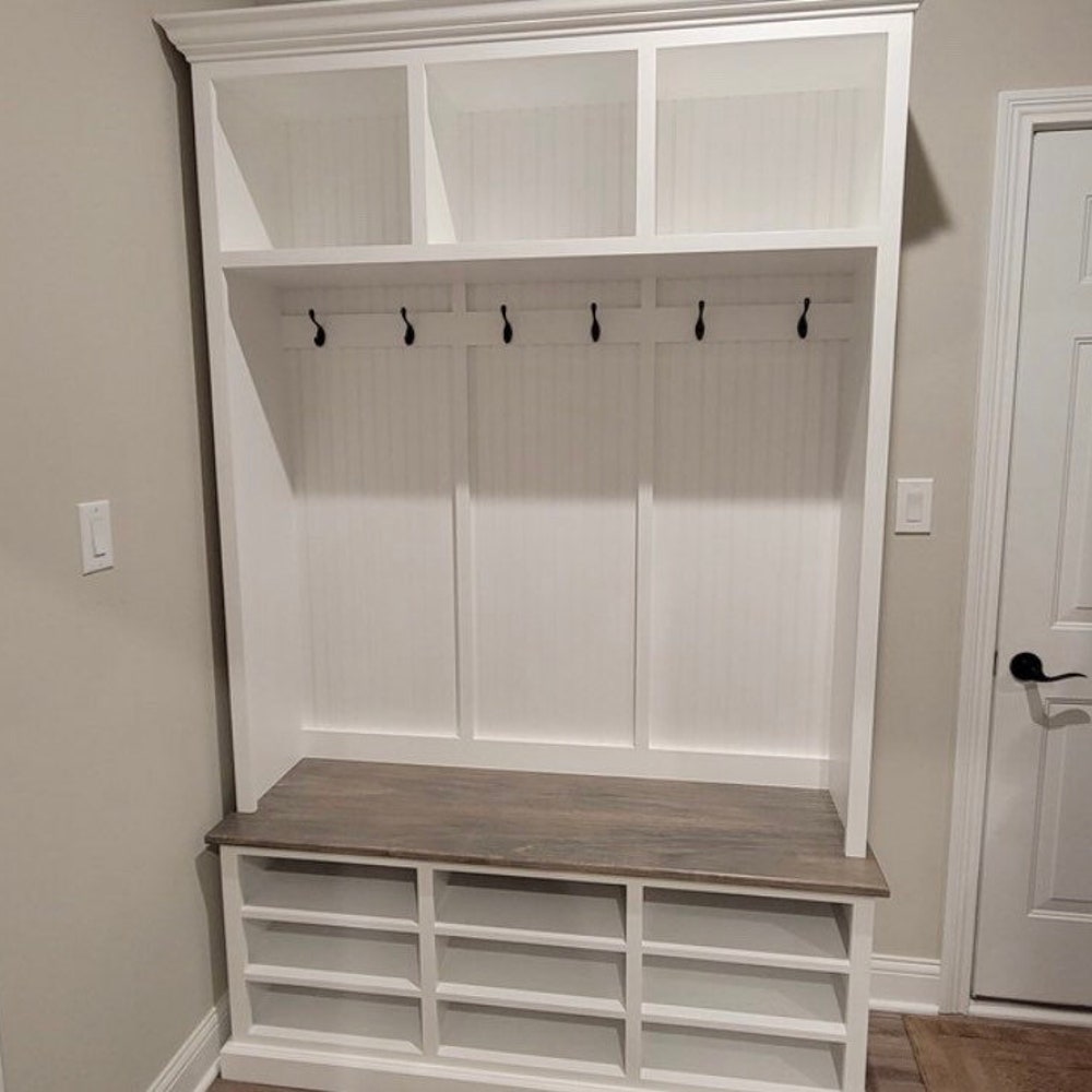 Mudroom entryway organizer bench, shoe storage and coat rack that allows for the perfect place to put your shoes, coats and bags! This unit is handcrafted made to order, comes with 6 standard hooks and lots of shoe storage. COLOR CHOICE:Shown Painted white with a protective finish and a stained dark walnut seat. Custom colors […]