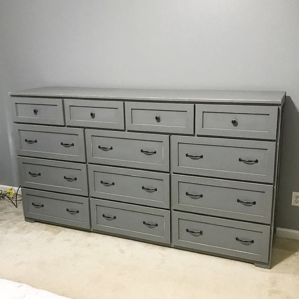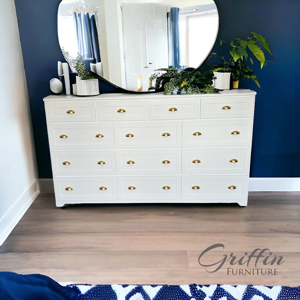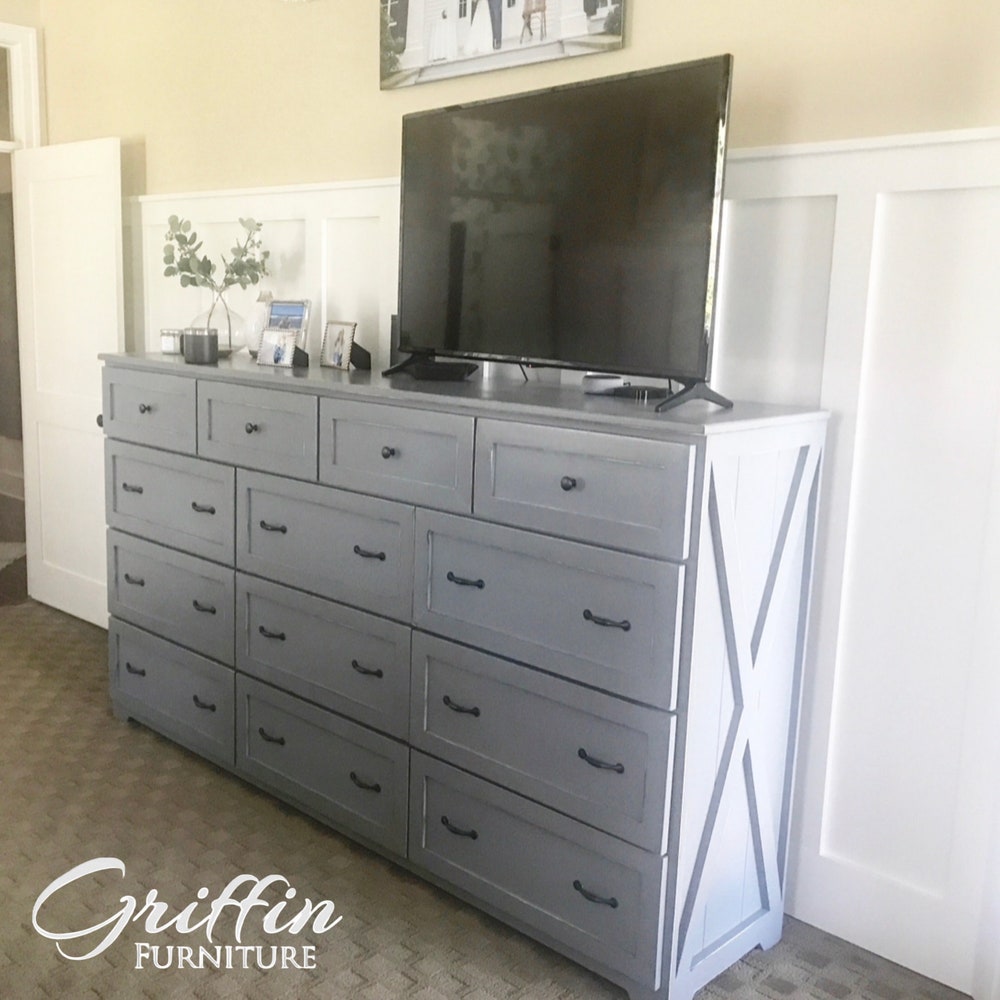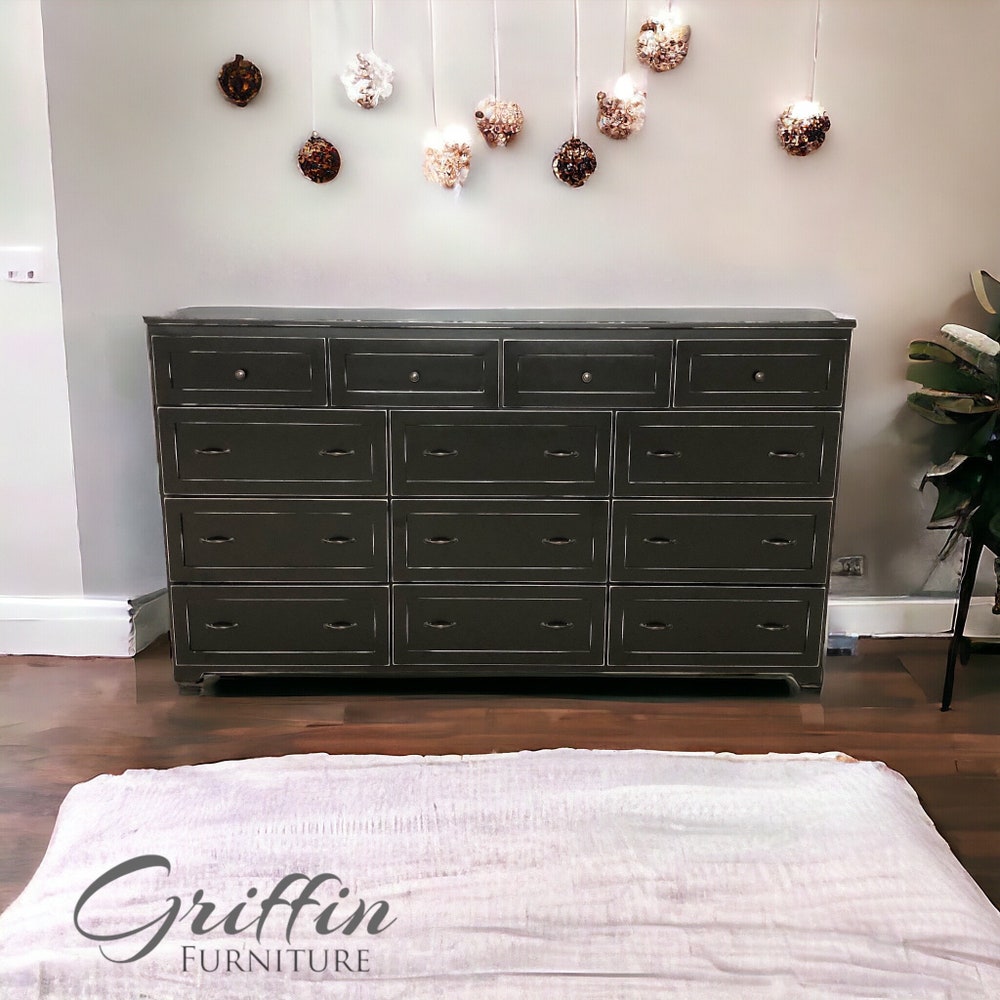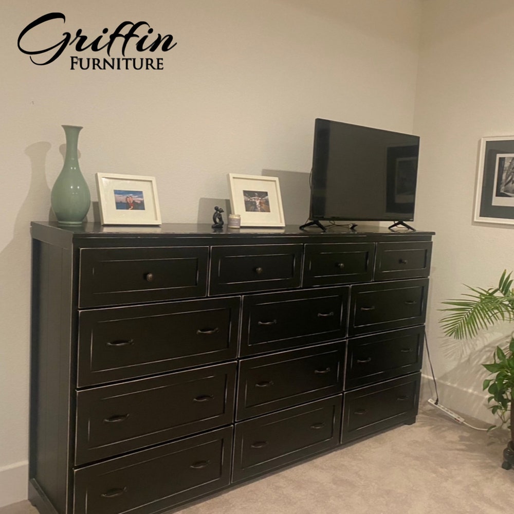 THE MARIETTA oversize dresser features a rustic farmhouse-style design, this dresser has a charming look that stands out and demands your attention. Take advantage of thirteen spacious drawers to organize your space. This dresser is built from all wood and full extension drawer slides. Handles are optional on this dresser (It will come with handles unless specified).