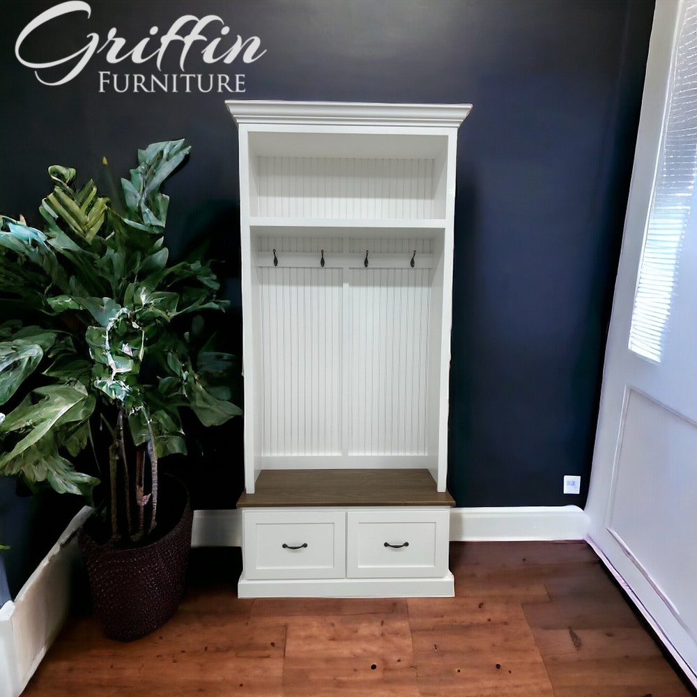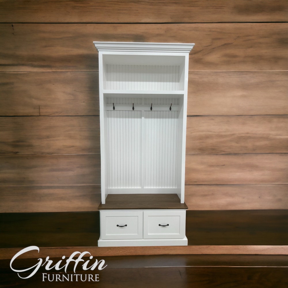 Looking for a convenient storage solution for your shoes, coats, and bags? Our mudroom lockers with benches and drawers are perfect for you! Each unit is meticulously crafted to order and features four standard hooks for added convenience. Plus, the drawers are equipped with 100-pound slides, allowing for effortless opening and closing.