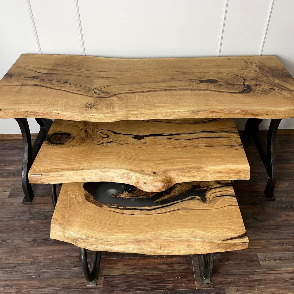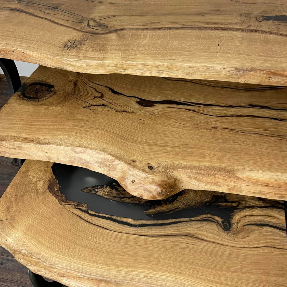 Oak live edge dining coffee table with epoxy resin black steel shaped machinary legs loft industrial modern solid massive table unique MFW