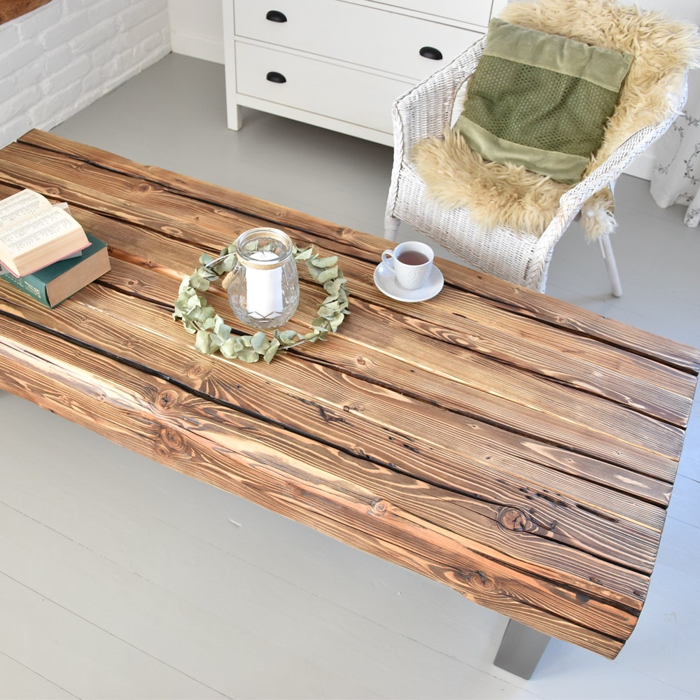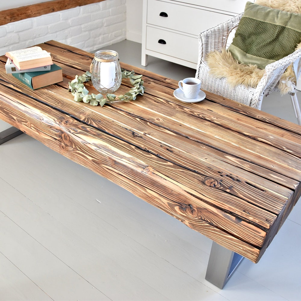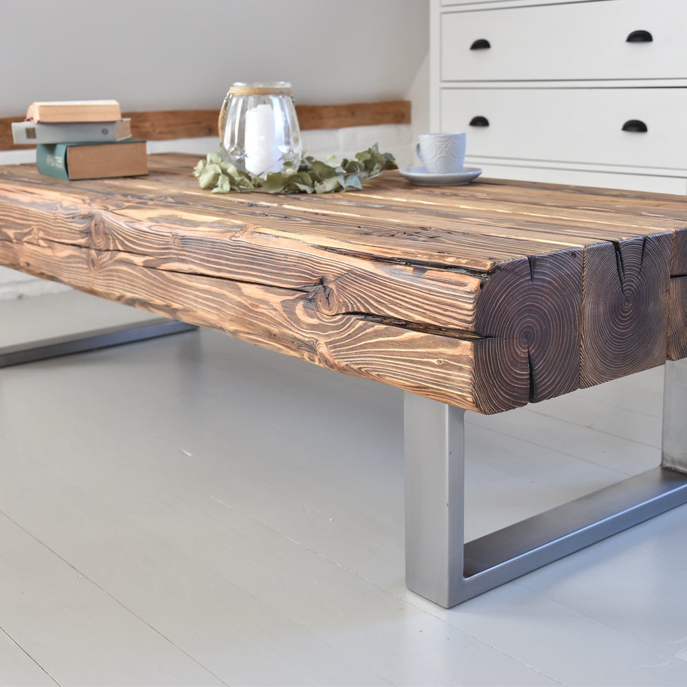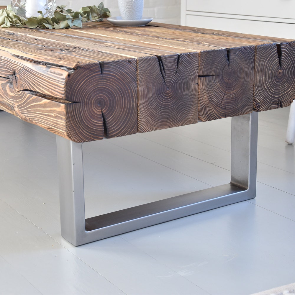 Old beams coffee table silver steel legs industrial rustic country loft style organic reclaimed solid natural barn wood massive MFW design