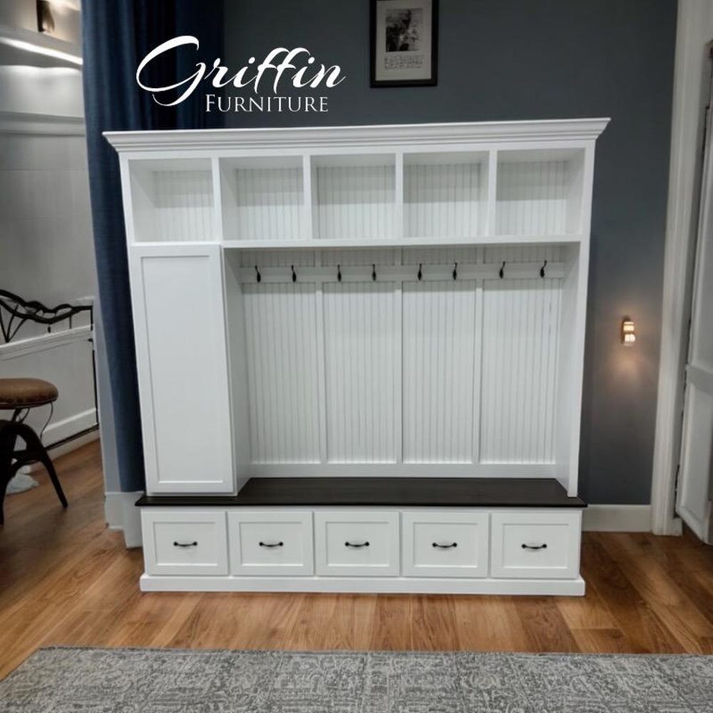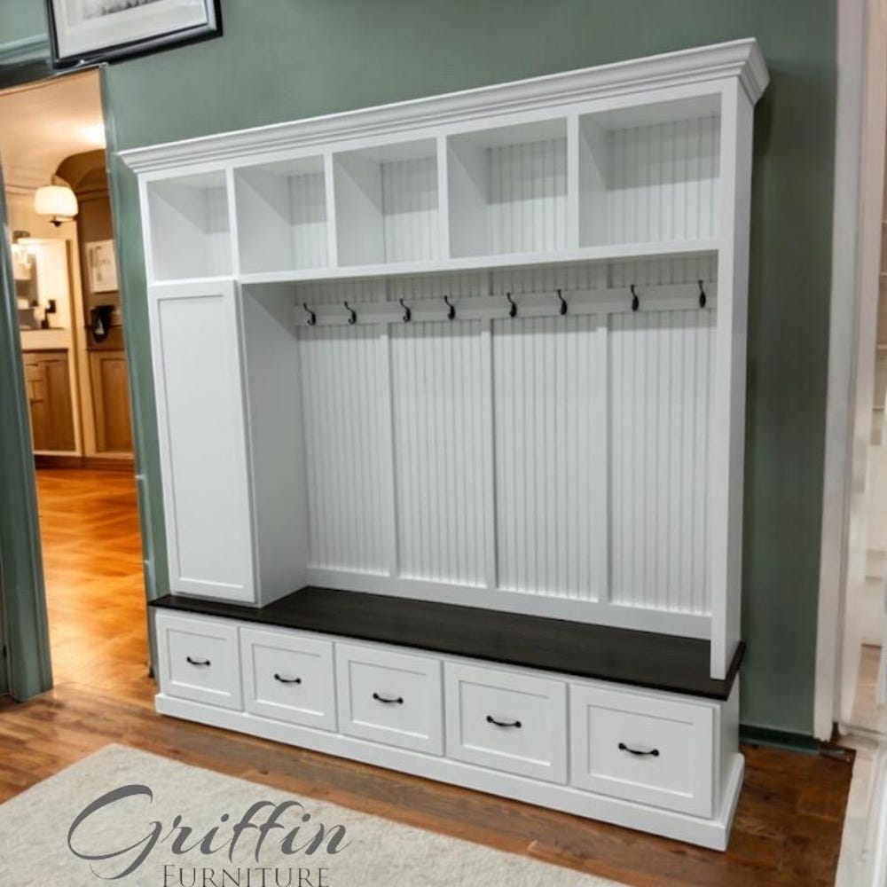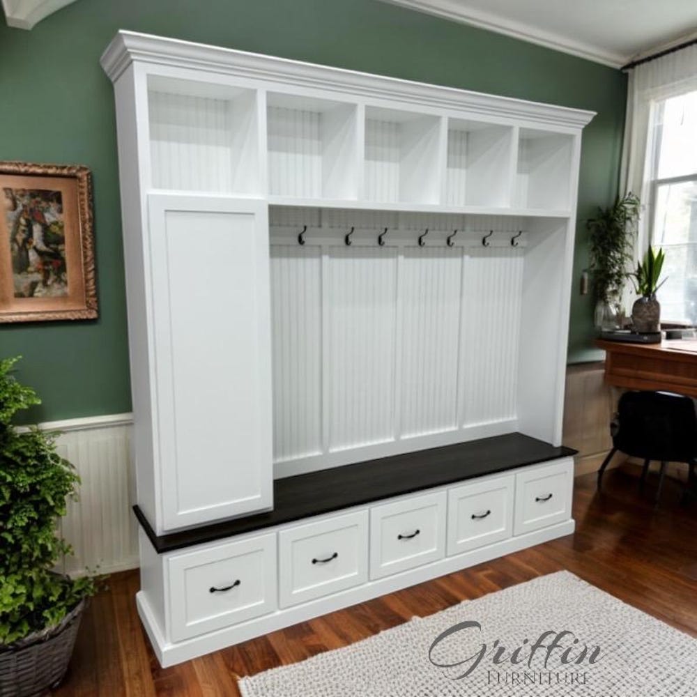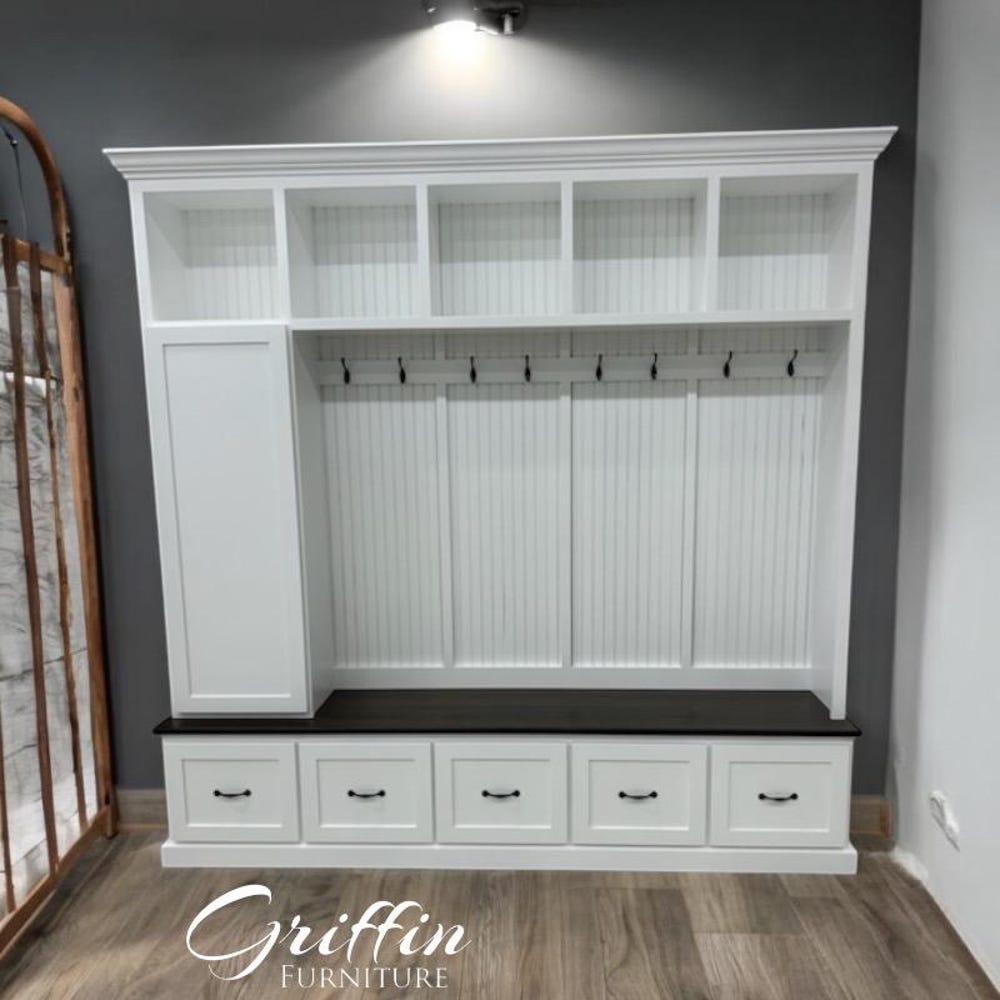 Transform your entryway with our custom-made mudroom bench, designed for both style and functionality. This spacious mudroom bench features ample storage space, making it the perfect solution for organizing shoes, coats, and everyday essentials. Each unit is handmade with precision and comes equipped with 10 standard hooks for added convenience.