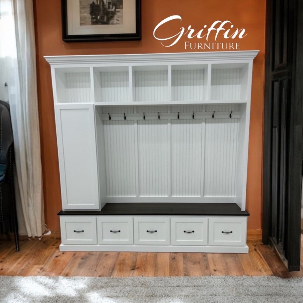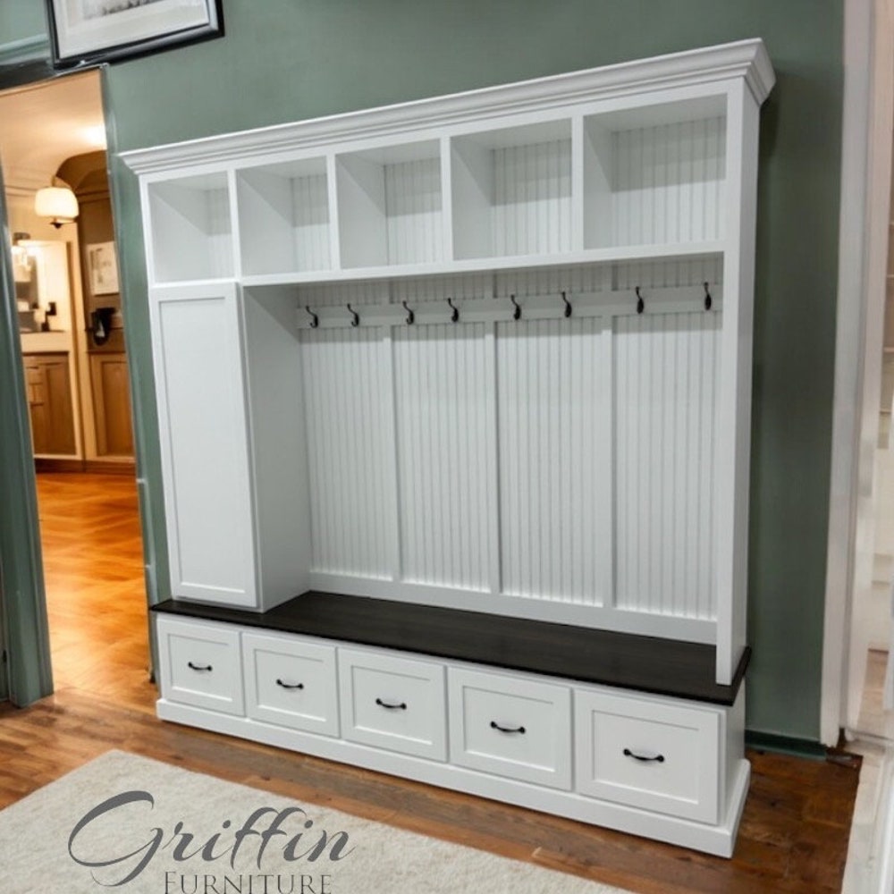 Transform your entryway with our custom-made mudroom bench, designed for both style and functionality. This spacious mudroom bench features ample storage space, making it the perfect solution for organizing shoes, coats, and everyday essentials. Each unit is handmade with precision and comes equipped with 10 standard hooks for added convenience.