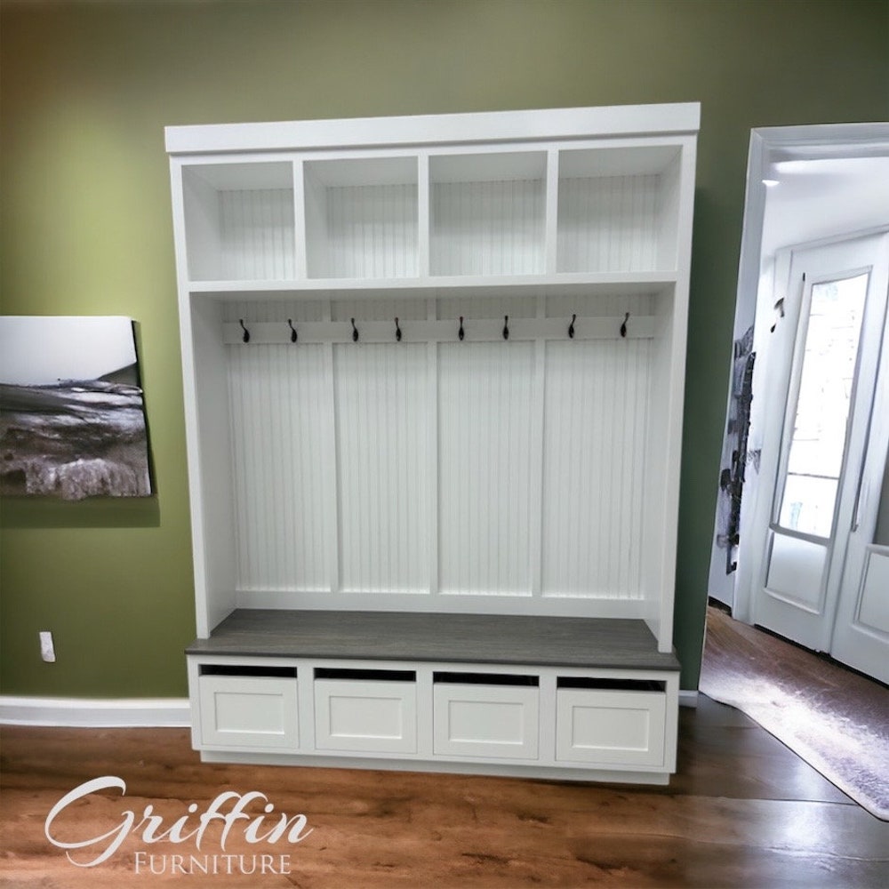 Transform your entryway into a welcoming and functional space with our handcrafted hall tree that features a bench and shoe storage. Keep your coats and bags organized and easily accessible with this custom-made piece that comes with 8 hooks, including two inside the cabinet. With its exquisite design, you can now keep your entryway clean and tidy while adding a touch of elegance to your home.