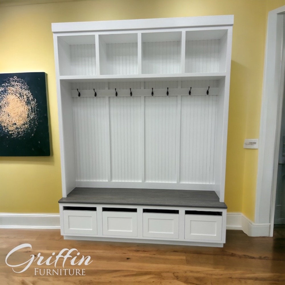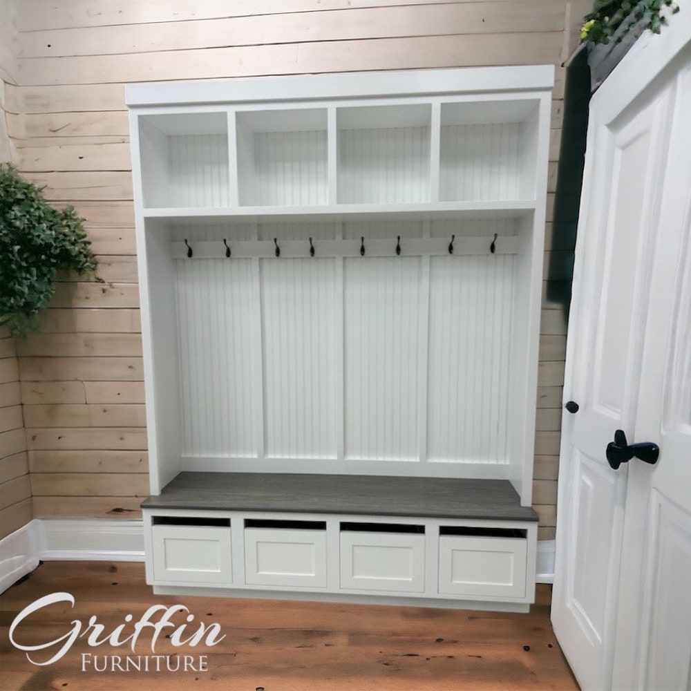 The dimensions of the unit are 85 inches in height, 72 inches in width, and 17 inches in depth. The bench measures 70 inches in width, 17 inches in depth, and 18 inches in height. It features four cubbies, four vented drawers down bottom, and eight hooks.