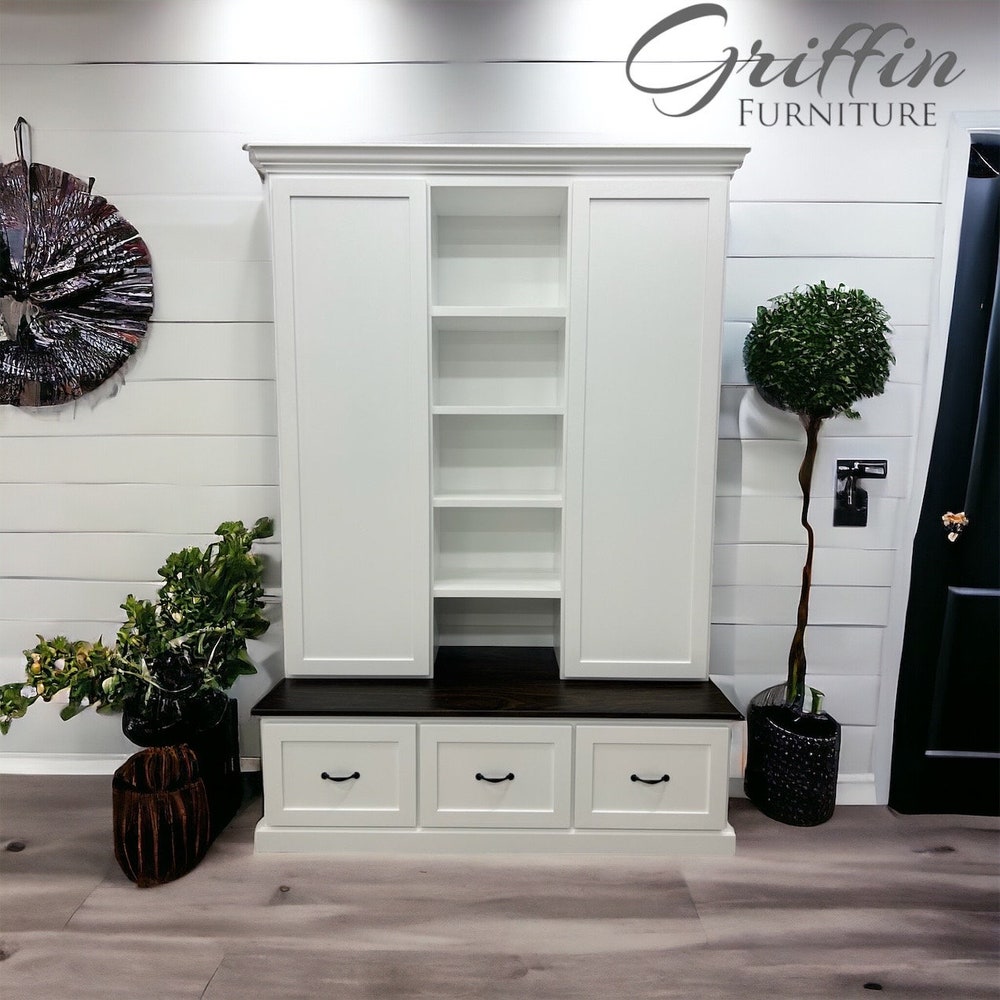 This mudroom locker hall tree bench has shelving in the middle for small items to maximize your space. We use soft close drawer slides and rubbed oil bronze hardware.