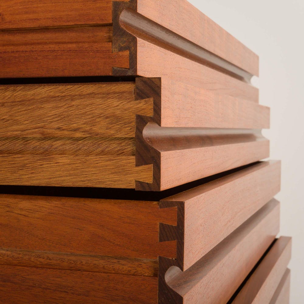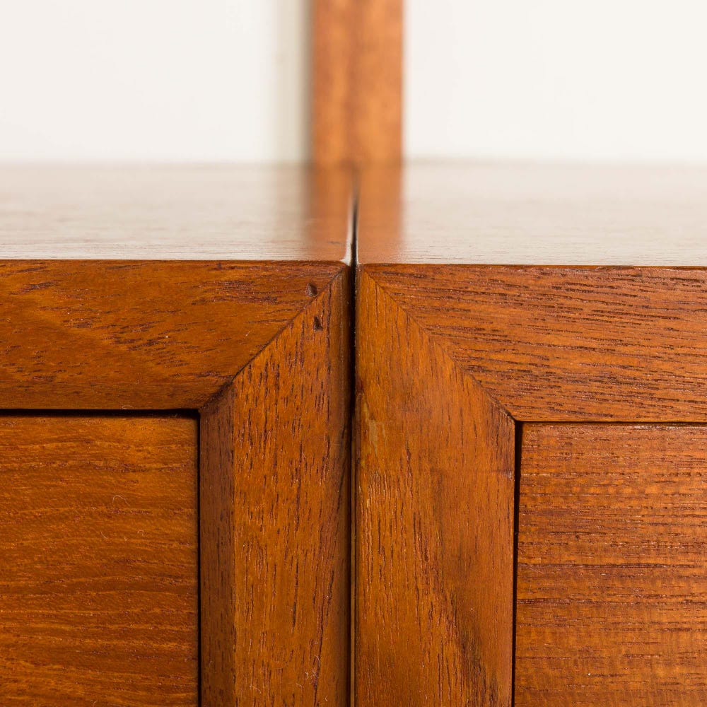 Masterful joinery is showcased in the construction of cabinets and dovetailing of the drawer fronts, a demanding and increasingly rare technique in modern furniture making. The nicely integrated, nearly invisible handles sculpted in solid wood, along with the sleek, frame-like profile surrounding the drawers, are characteristic of Cadovius’ designs.