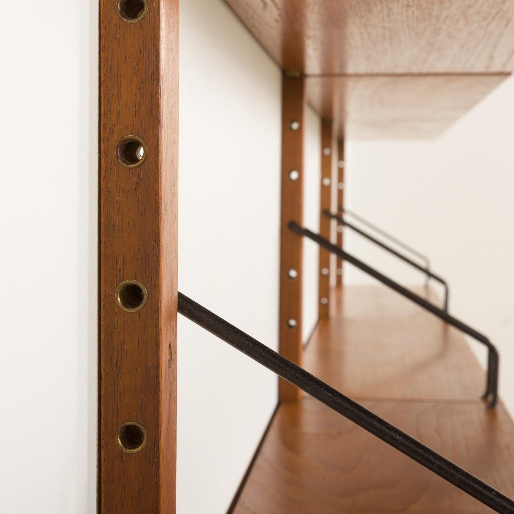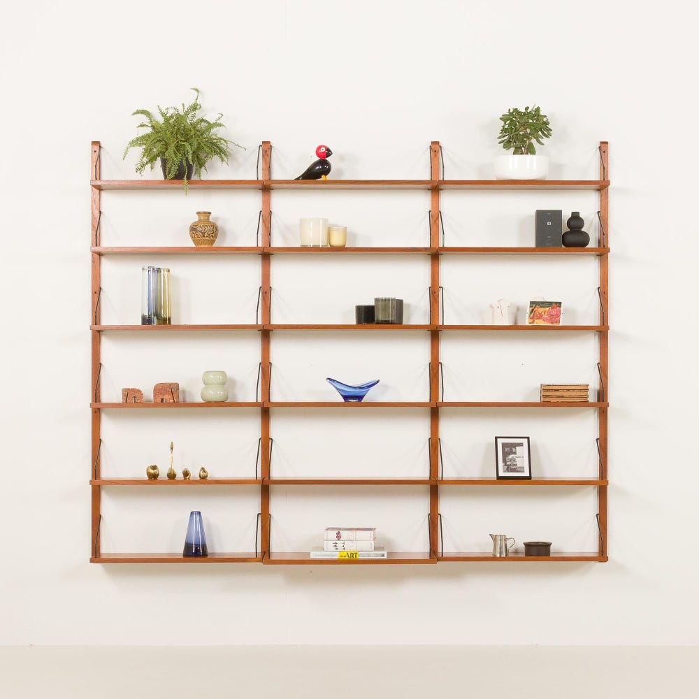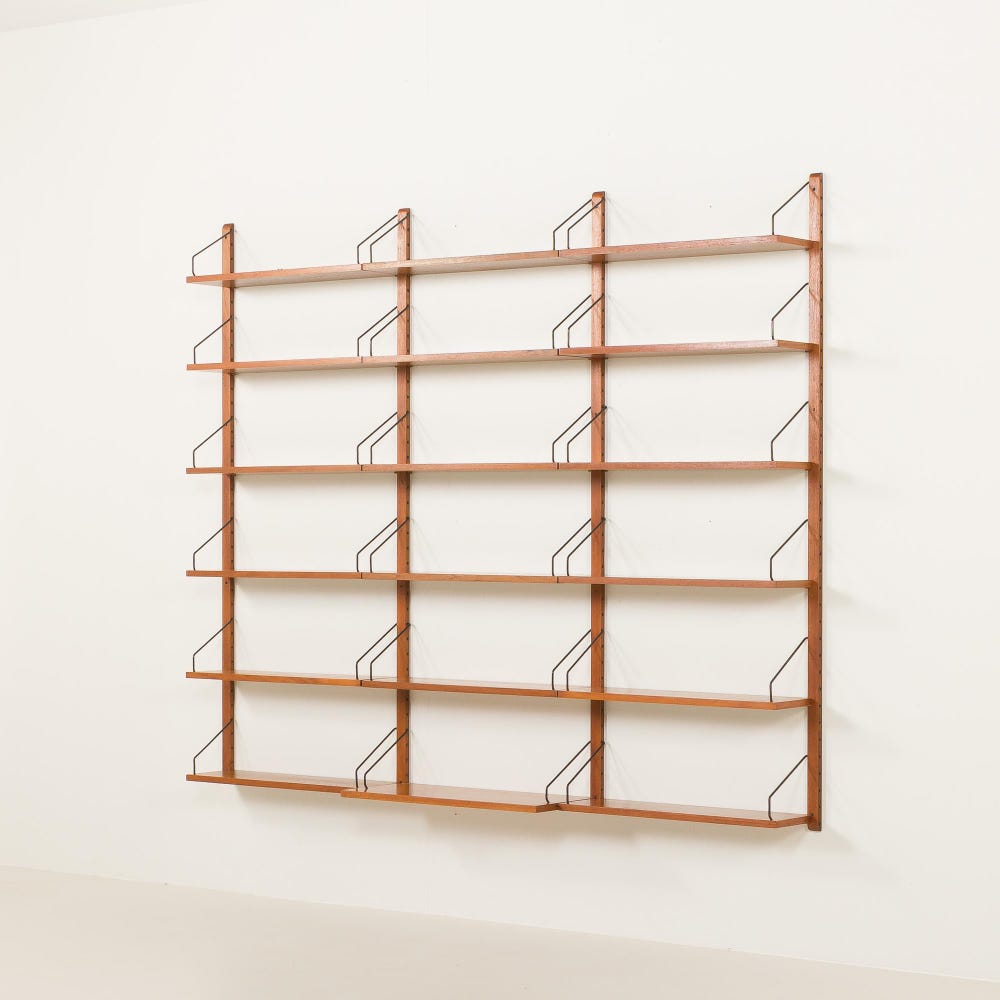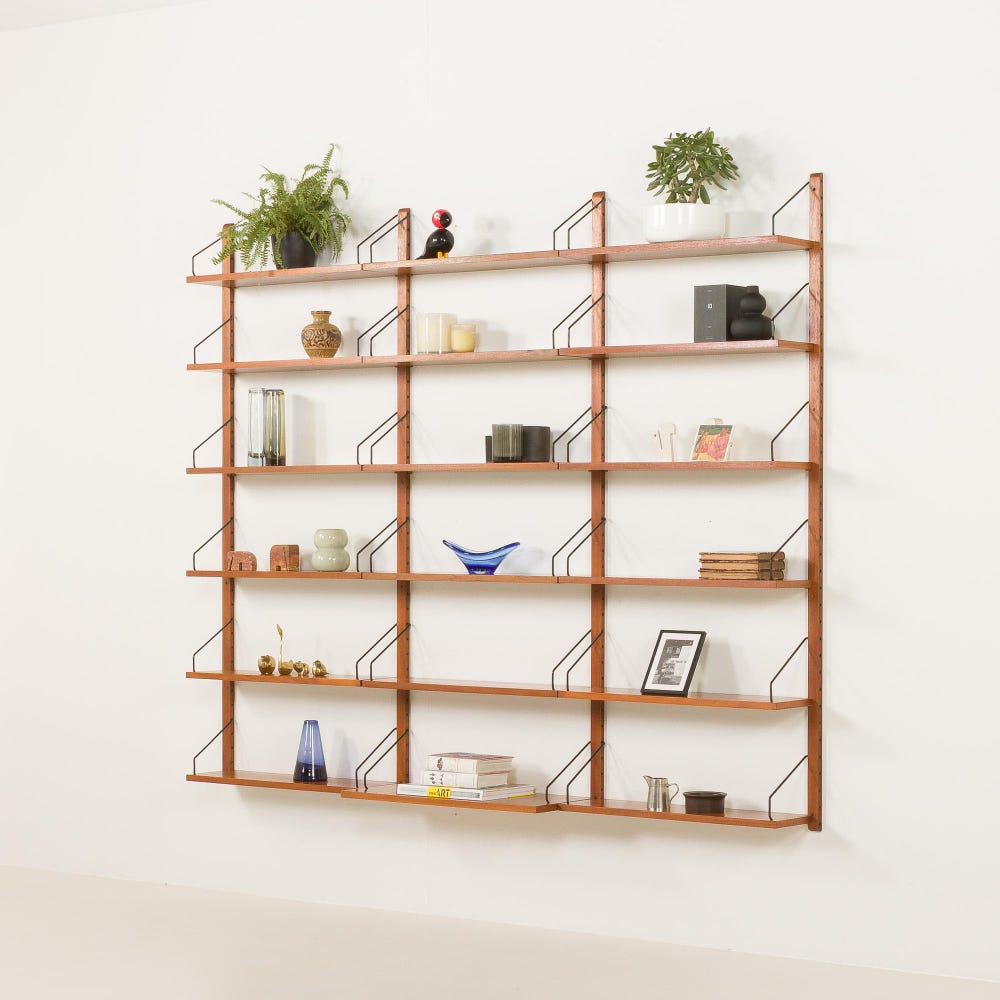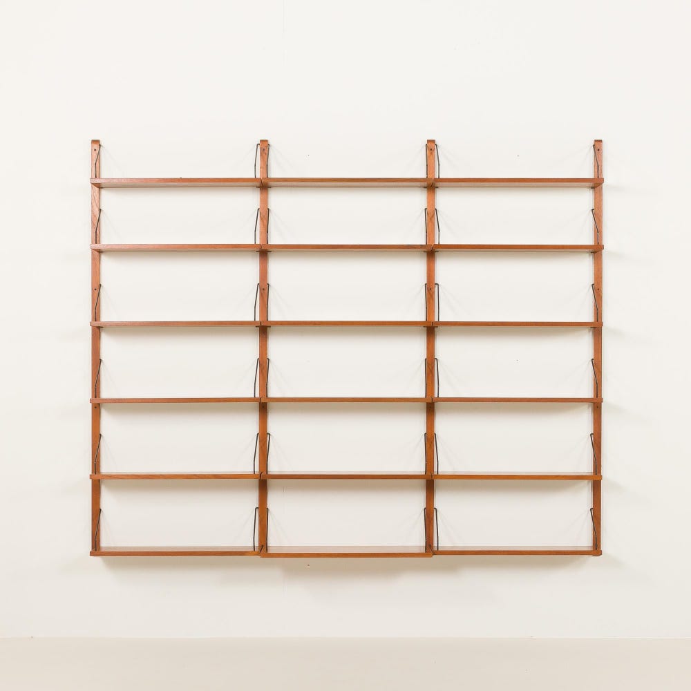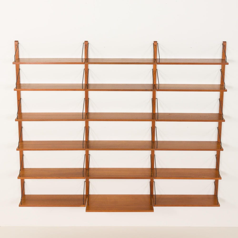 An impressive and rare Poul Cadovius shelving unit made by his company Cado in the 1960s. It is ideal for book lovers and will enrich any living room or bedroom with a mid-century modern touch. This set is an entirely modular shelving system with eighteen shelves, including one deeper – 30 cm. It is a rare wall uit with each section 70 cm wide, while most of Cadovius’s systems have been based on 80cm width.