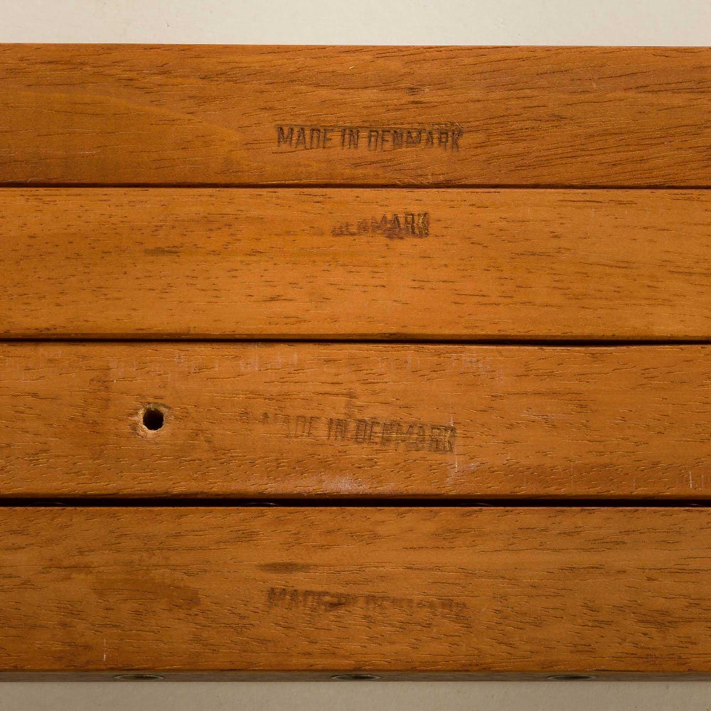 The original manufacturer engraving ”made in Denmark” on shelves and rails confirms its origin.