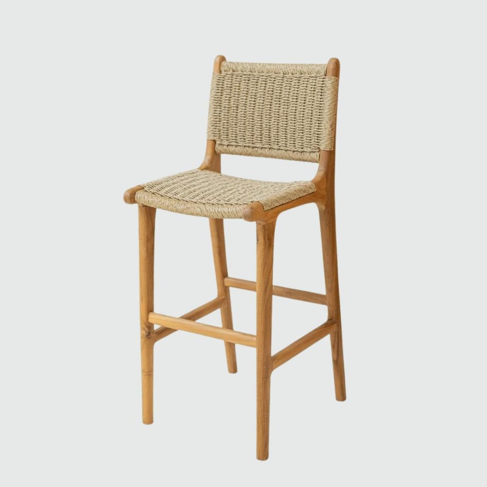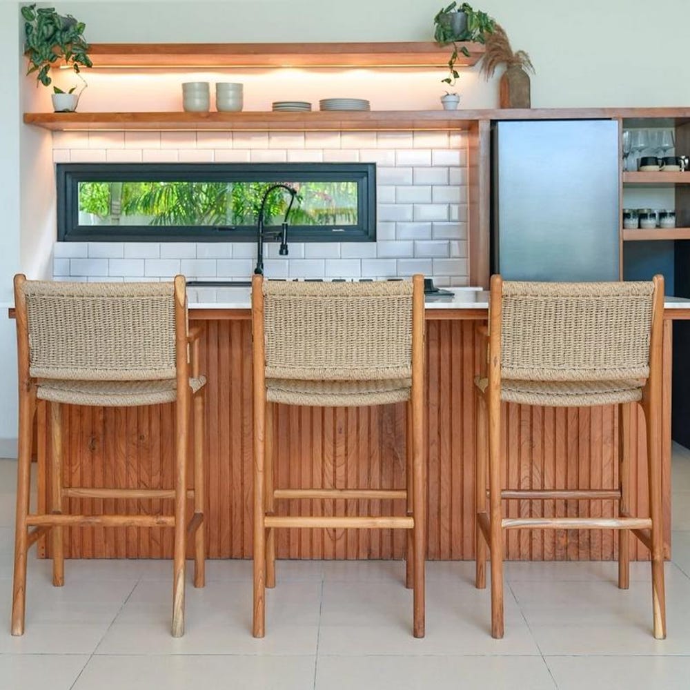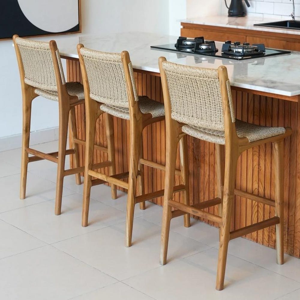 Upgrade your space with our handcrafted Rattan Bar Stool, designed for modern kitchens and boho homes. Made from solid natural teak wood and premium synthetic rattan, this counter-height stool offers both comfort and durability. The ergonomic backrest provides extra support, while the weather-resistant finish allows for indoor or outdoor use. Whether at a kitchen island, home bar, or patio, this bar chair brings rustic charm and timeless style to any setting.