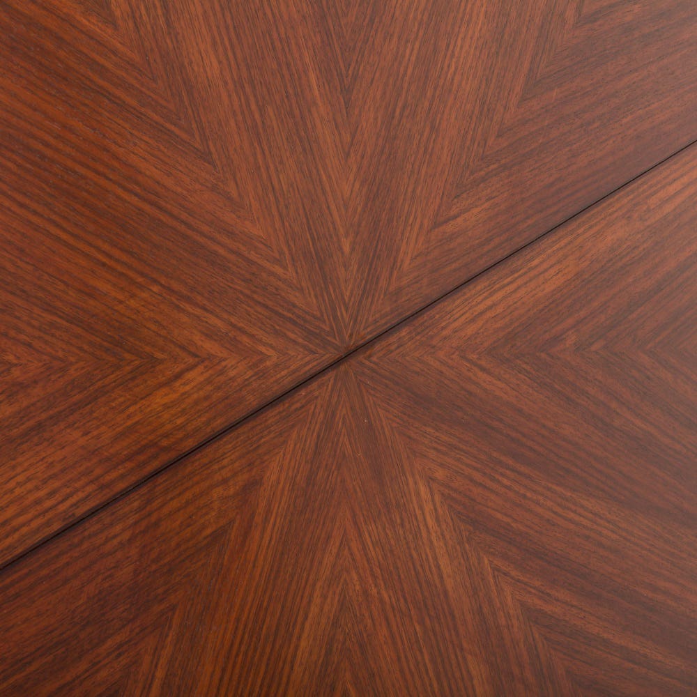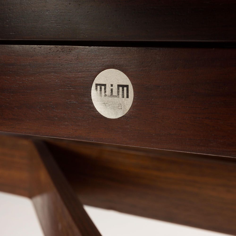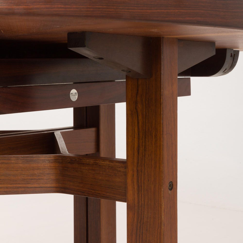The craftsmanship of the Olbia table is exemplary. The rosewood used in its construction is prized for its rich color and durability. The meticulously crafted surface, highlighted by the precisely laid, starburst-patterned rosewood veneer, showcases the natural beauty of the wood. The geometrically designed, robust legs, joined by wooden bent structures, create a visually striking and structurally sound base. This combination of warm rosewood and the interestingly shaped base, along with the addition of cool metal feet, adds a touch of modernity to the table’s mid-century roots.