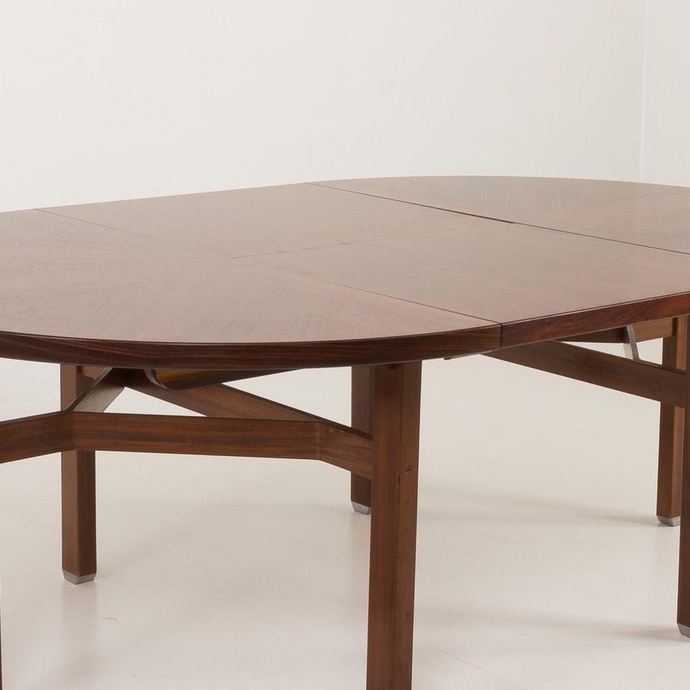 This round extension rosewood dining table was designed in 1958 by Ico and Louisa Parisi for MIM (Mobili Italiani Moderni). Known as model Olbia, this table is a remarkable piece of mid-century modern furniture. Ico Parisi, a renowned Italian architect and designer, often collaborated with his wife Louisa, blending innovative design with impeccable craftsmanship. The Olbia model reflects their signature style, characterized by sleek lines, elegant forms, and a harmonious use of materials.