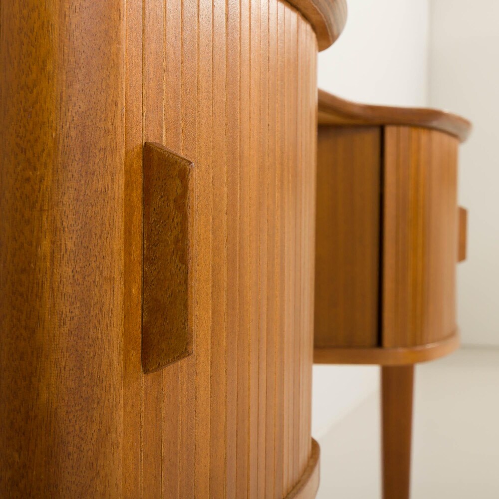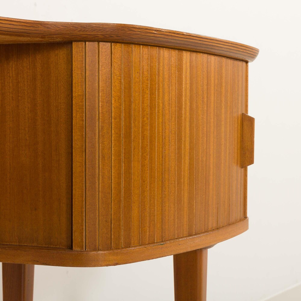 This rare vintage vanity has been fully restored and it is in a fantastic condition. The tambour door mechanism and the mirror’s hinges work smoothly. The wood has been cleaned and protected with professional compounds, and the mirror is intact.