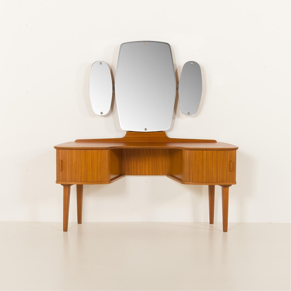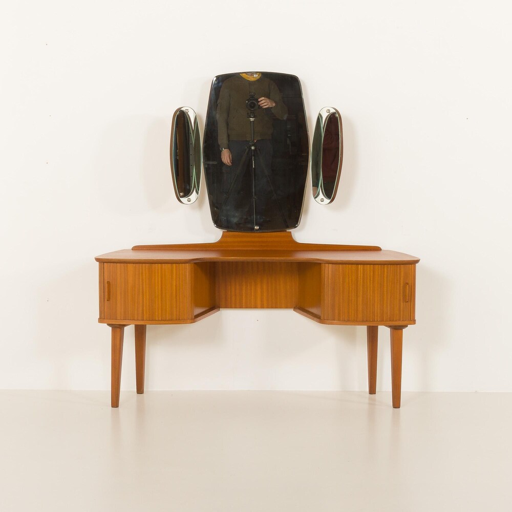 This charming Scandinavian dressing table was produced in the 1960s. It was most likely designed by Fredrik Kayser who was cooperating with Vikenbetween from 1956 to 1966. It is an exceptional example of high-quality Norwegian mid-century modern carpentry combined with elegance and functionalism.