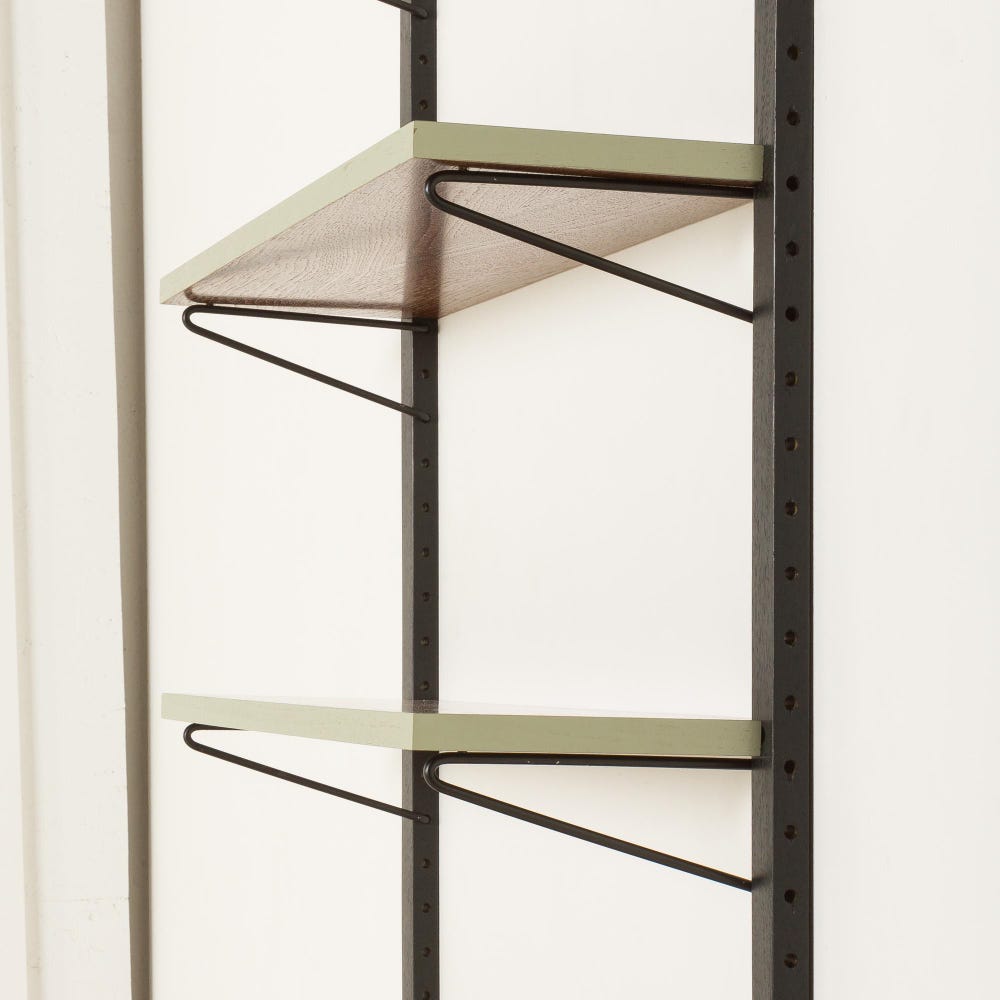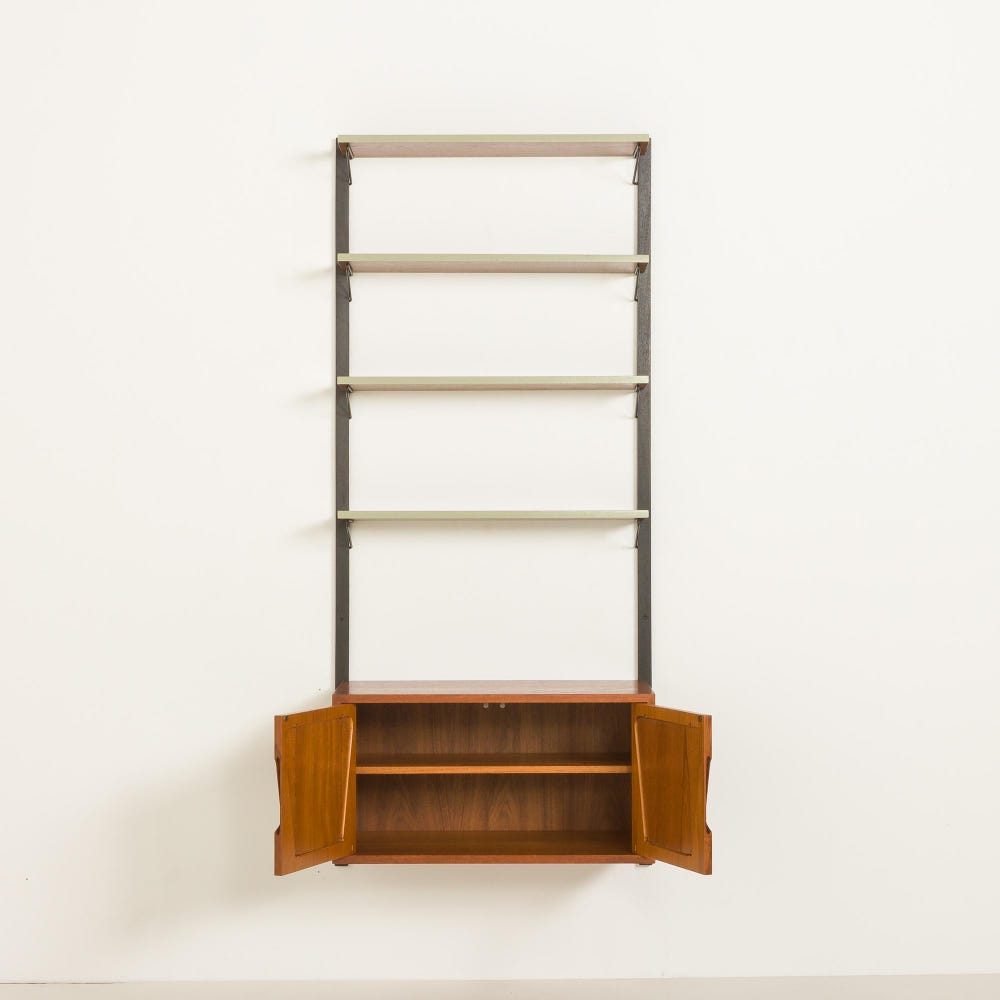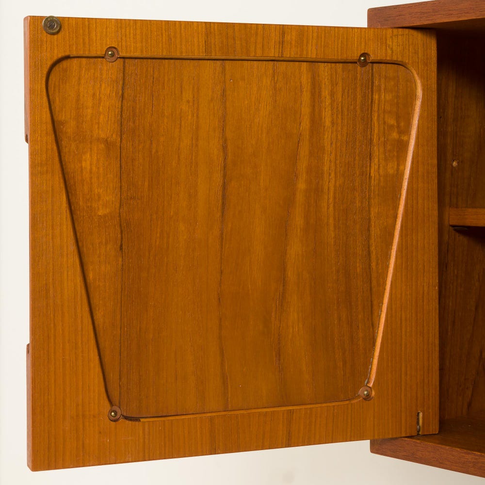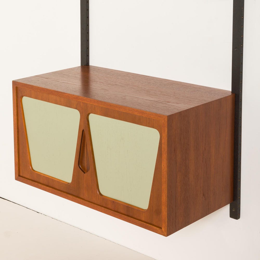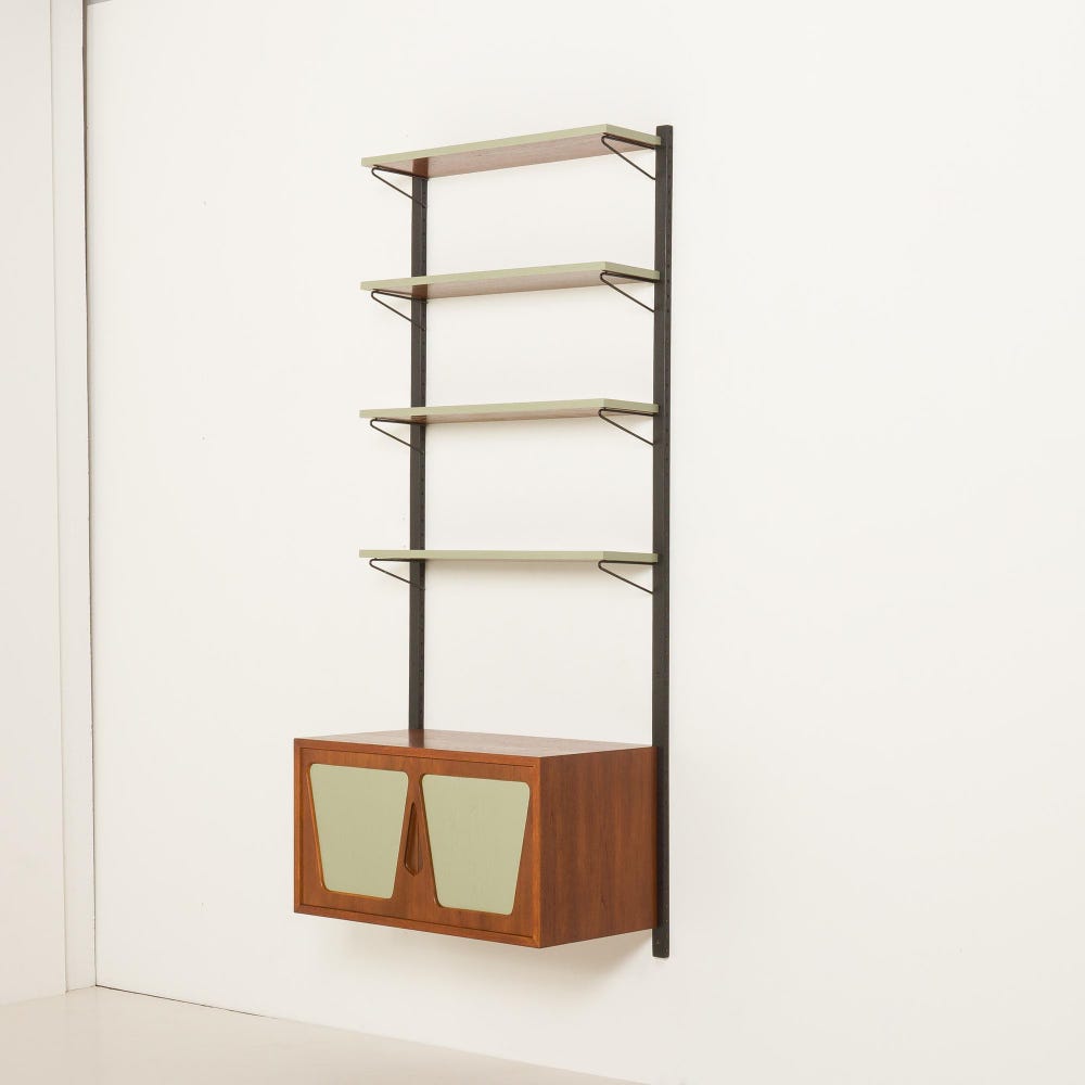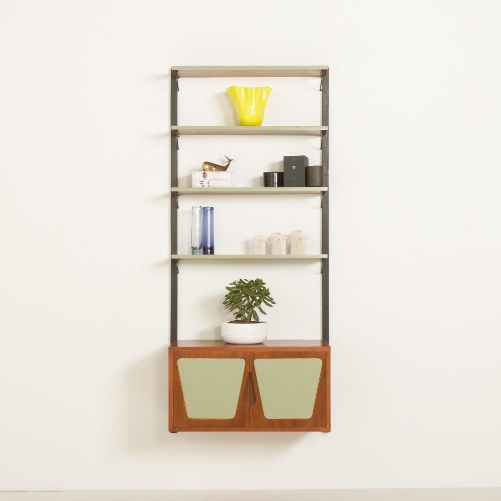 Renovated through upcycling, this one-bay wall system has been thoughtfully restored to bring new life to vintage materials—blending sustainability with timeless style. The unit features a unique cabinet with two sculptural doors. The soft green geometric lacquered inlays contrast beautifully with the warm teak veneer. Above, four matching green edge shelves are supported by slim […]