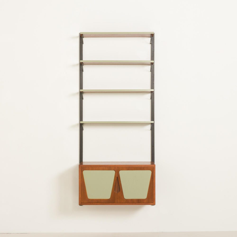The unit features a unique cabinet with two sculptural doors. The soft green geometric lacquered inlays contrast beautifully with the warm teak veneer. Above, four matching green edge shelves are supported by slim black metal brackets, offering a clean and airy silhouette ideal for both display and storage.