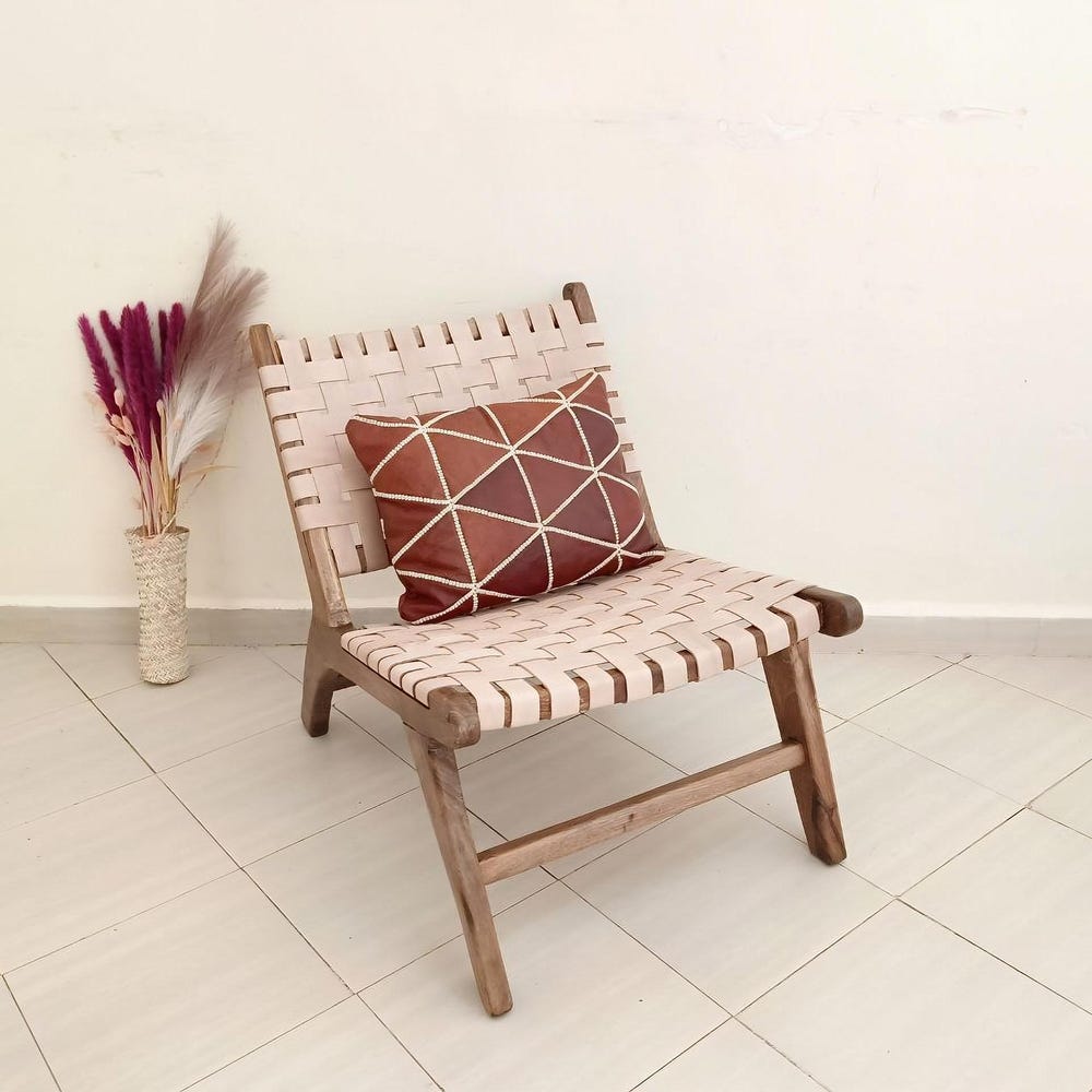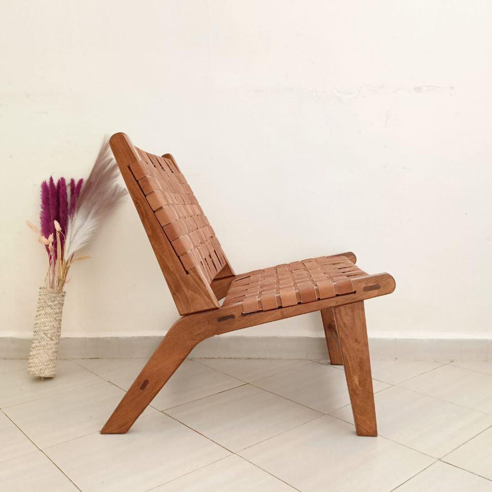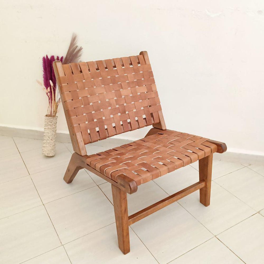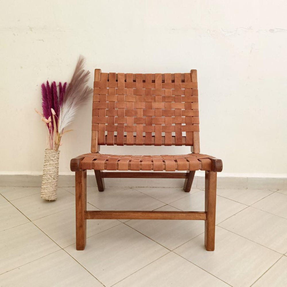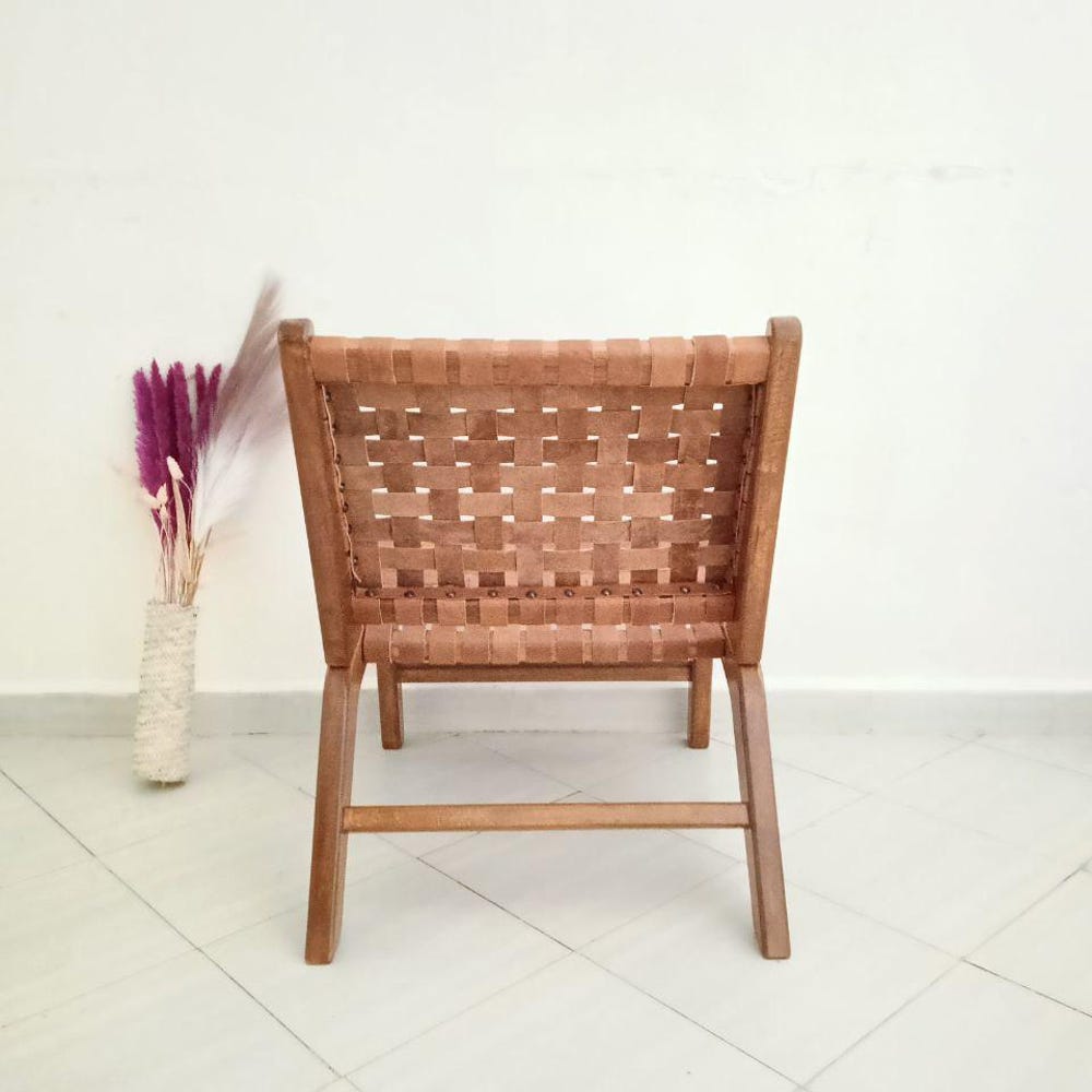 Enhance your living space with this Tan Woven Leather Chair, a modern boho accent chair crafted from solid walnut wood and genuine leather. Its sleek yet rustic design makes it perfect for a reading nook, living room, or lounge area. Handmade by skilled artisans, this chair offers durability, comfort, and timeless style. Whether you’re looking for a mid-century modern chair, a woven leather lounge chair, or a cozy boho accent piece, this unique furniture item adds warmth and character to any space.