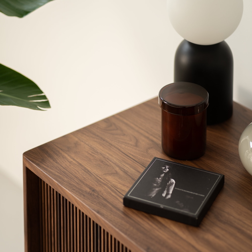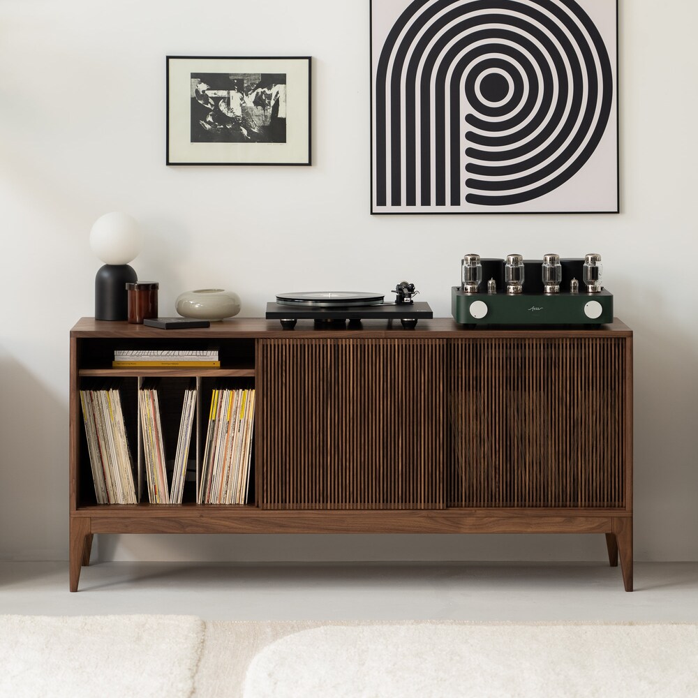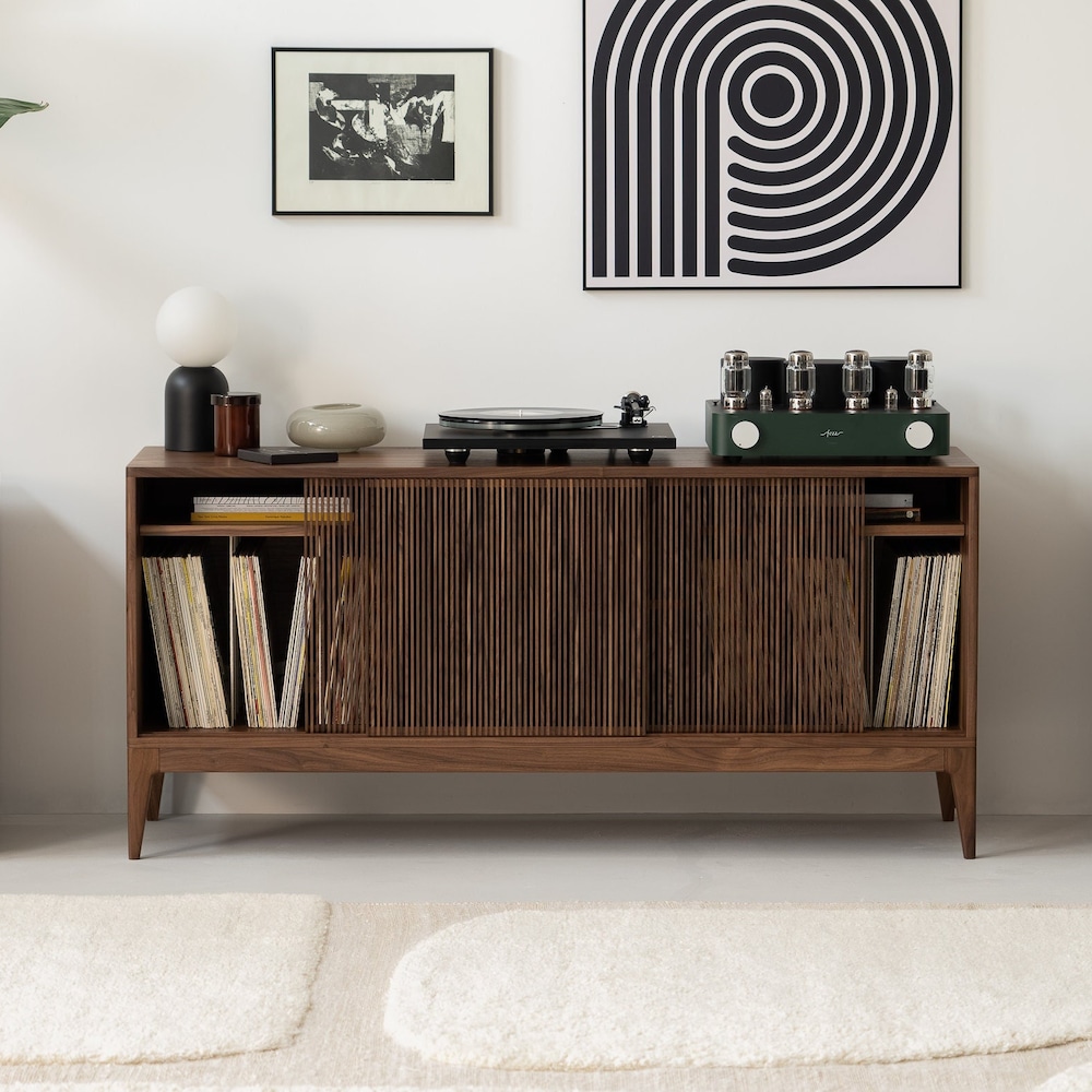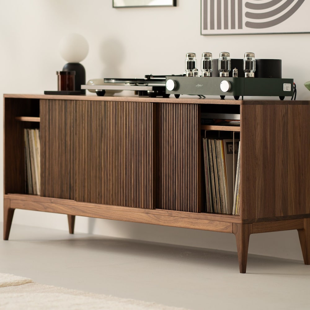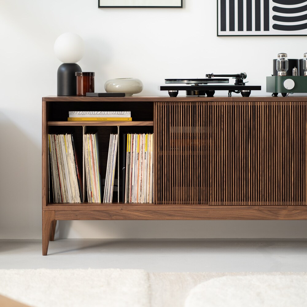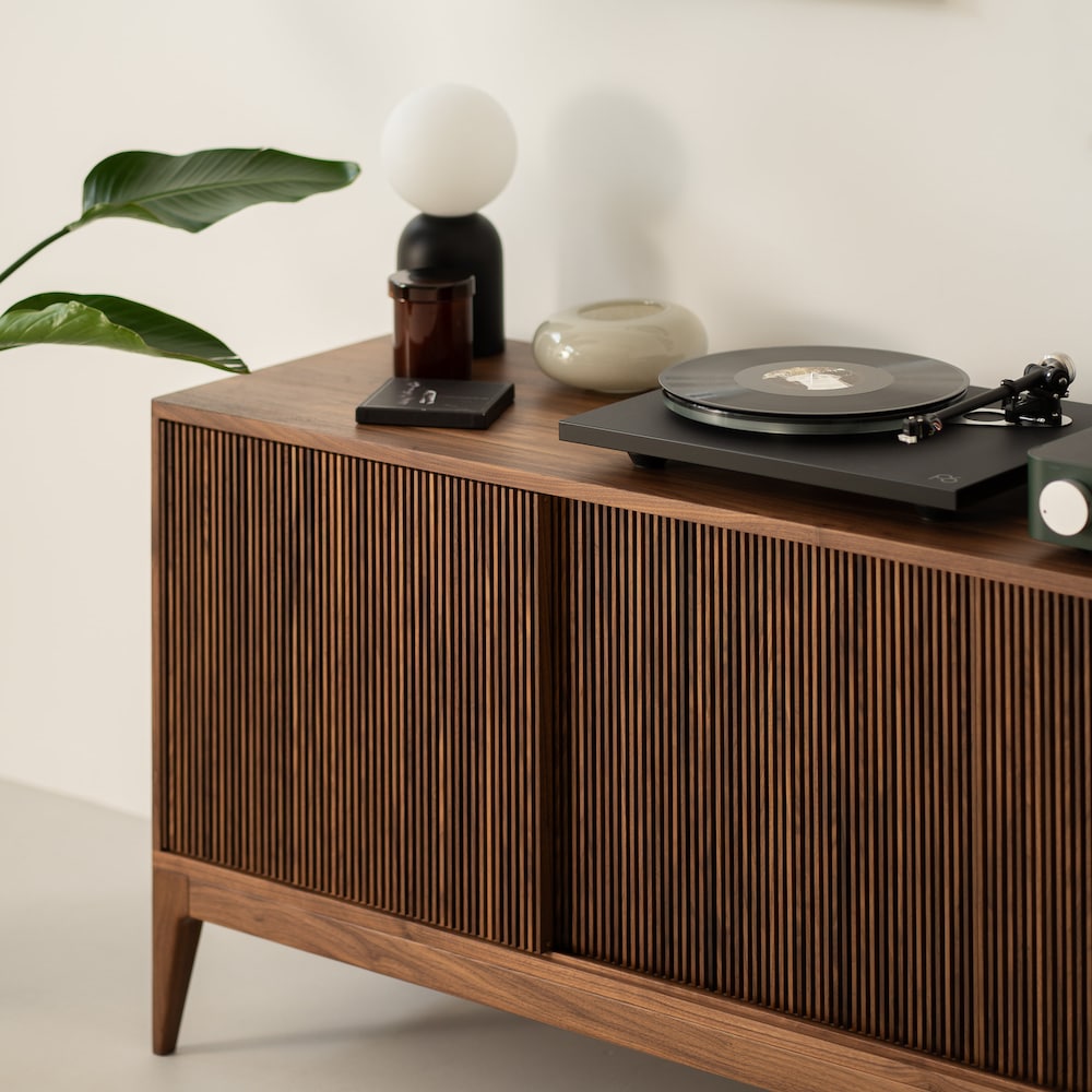 The TONN 150 record player stand, expertly crafted from durable American walnut wood, designed specifically to enhance your vinyl record collection. It impresses with its minimalist form, yet stands out for its functionality.