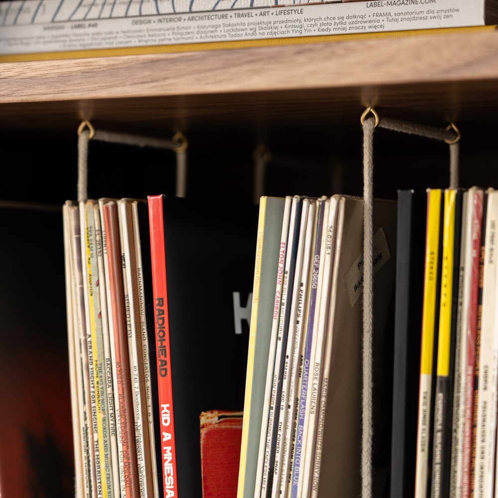 Customize the interior of the TONN 150 record player stand according to your preferences using adjustable shelves and visually appealing cotton cords, ensuring an organized display of your vinyl collection. Strategically placed openings at the back of the cabinet enable effortless cable and wire management, contributing to a neat and efficient setup.